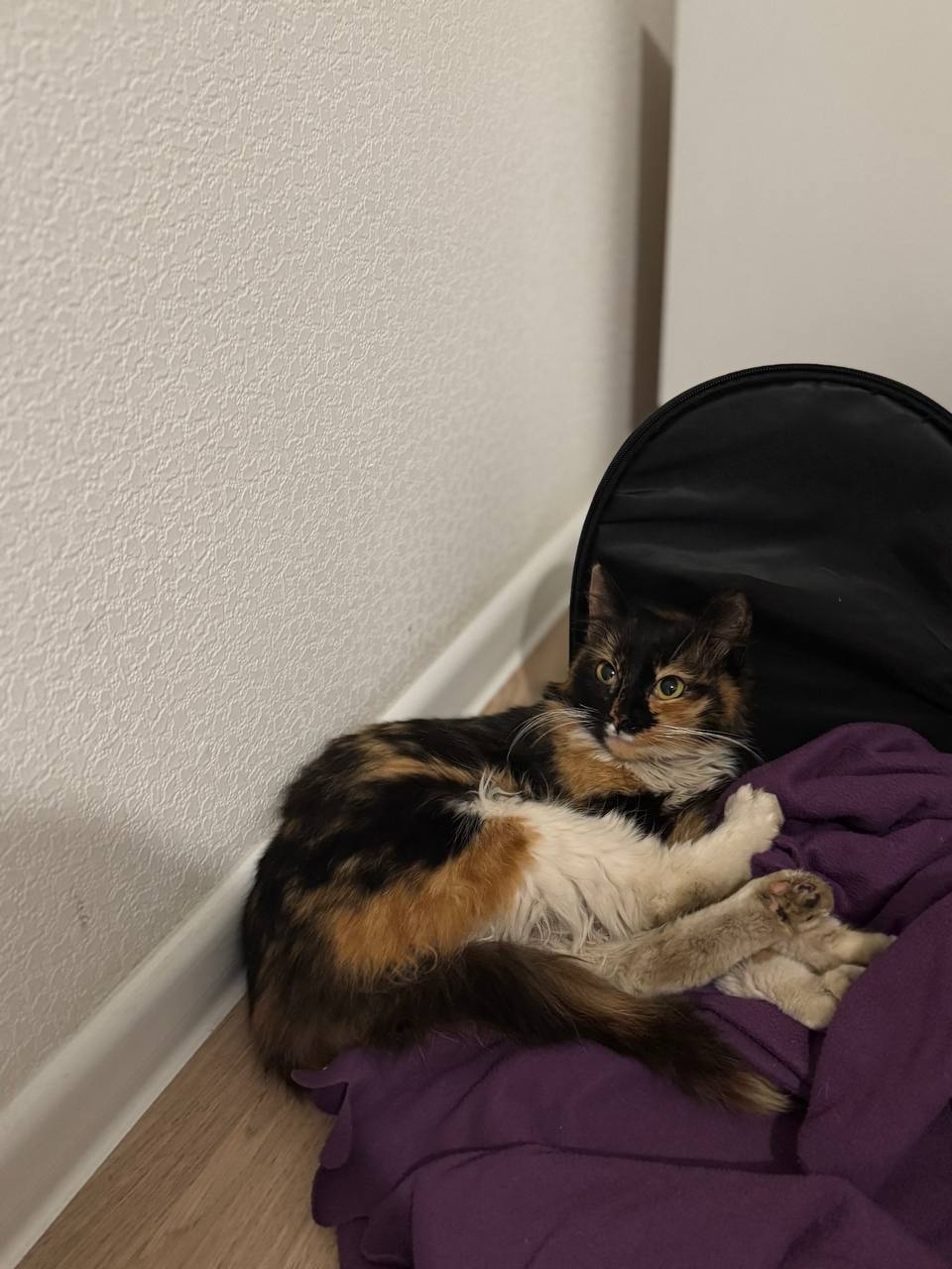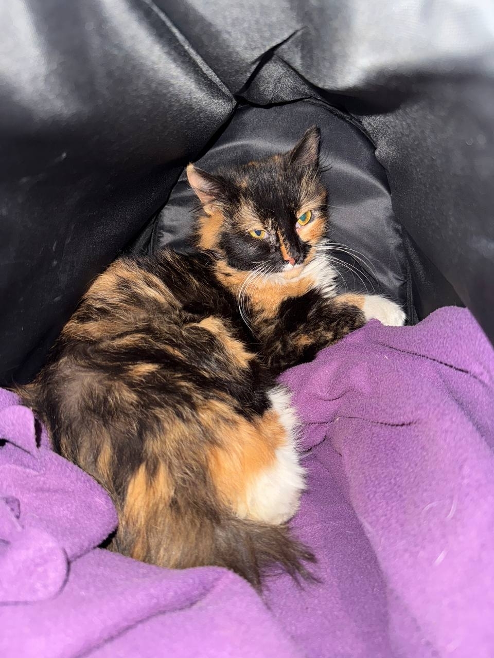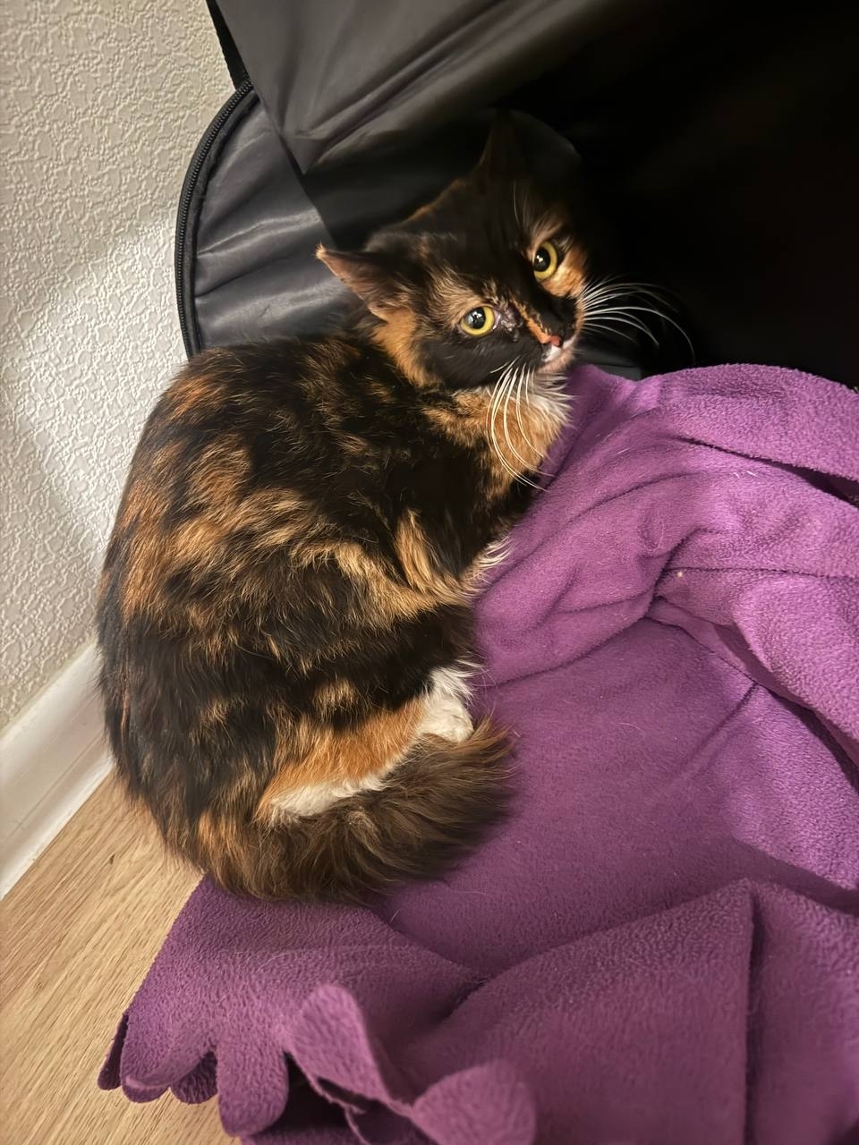 Её возраст примерно около года. Эта очаровательная малышка обладает нежностью трех цветов и своей особой хрупкостью. Сейчас ей особенно трудно, ведь она совсем недавно пережила стресс и находится в состоянии страха перед окружающими людьми. Однако, несмотря ни на что, она позволяет себя ласково погладить и искренне ждет своего счастья.