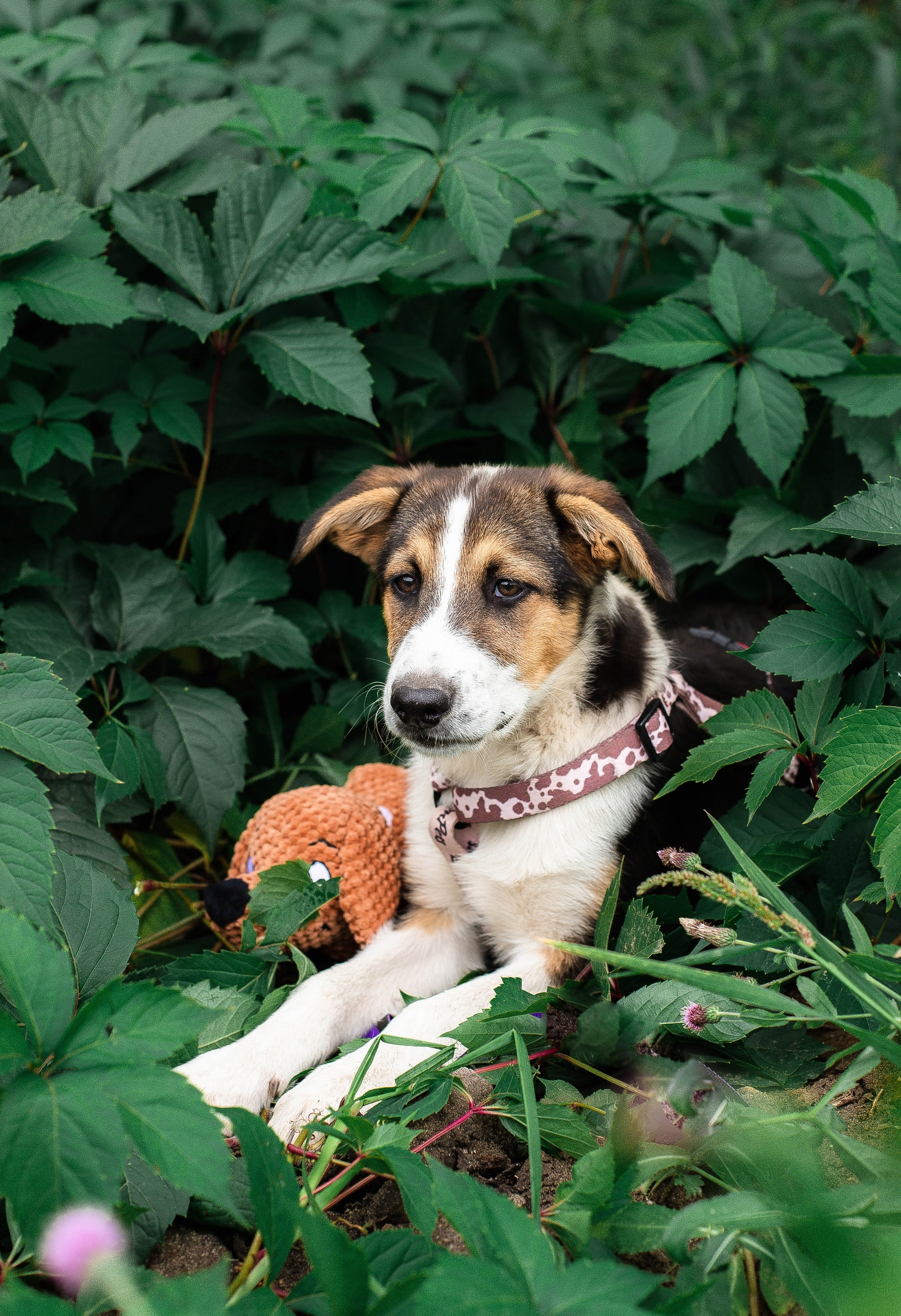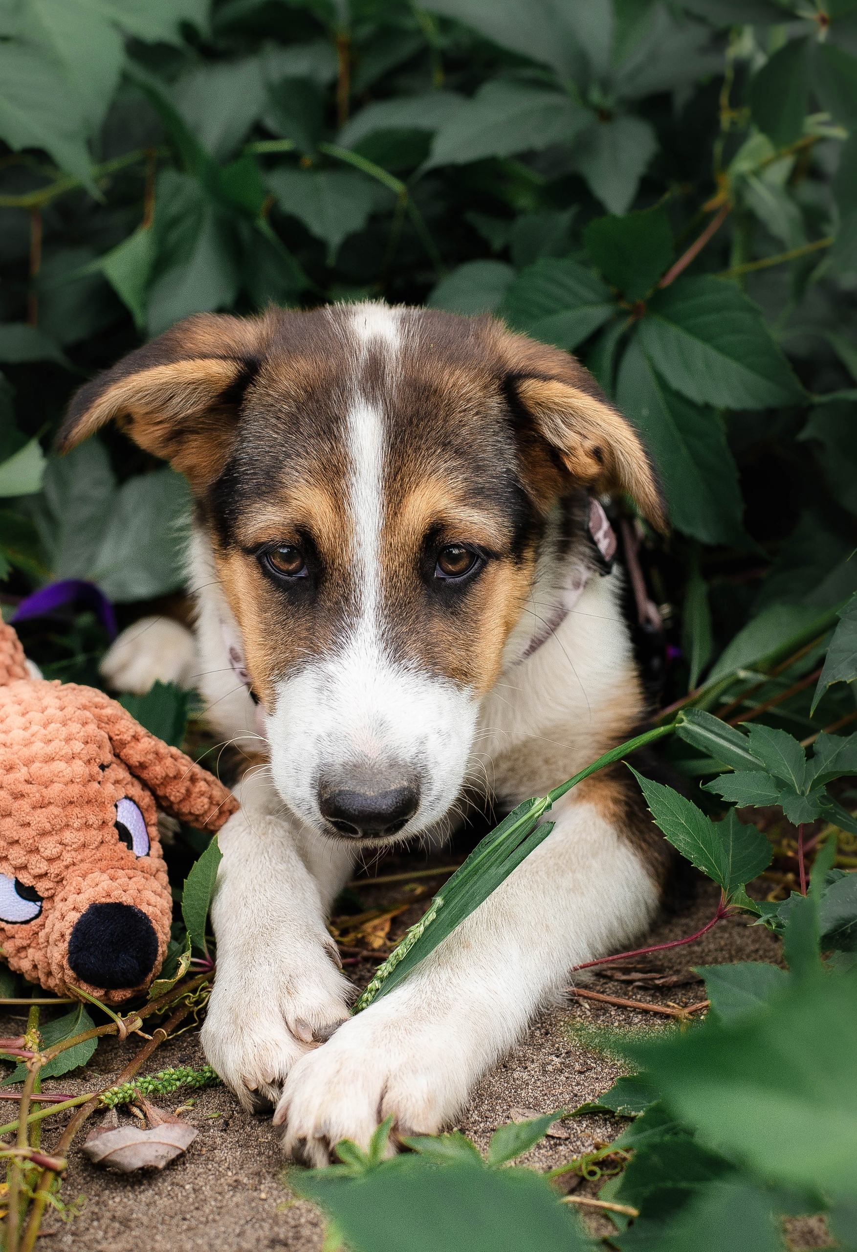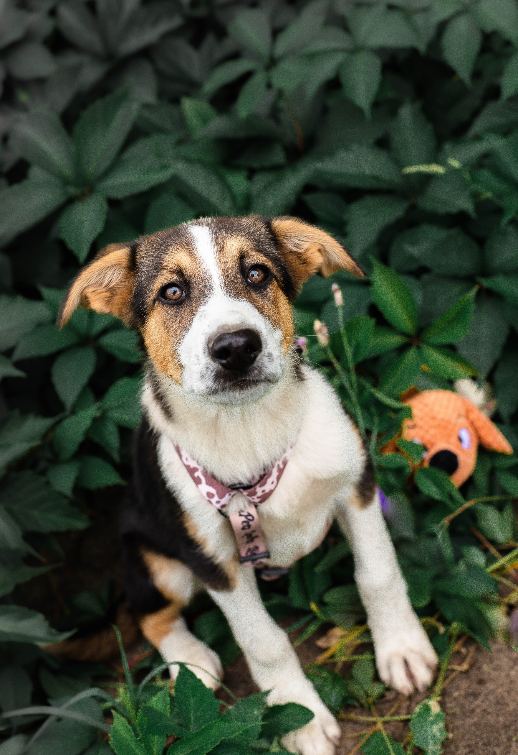 Дженнифер яркого окраса триколор, с трогательным взглядом. Вырастет среднего размера, до 25 кг.