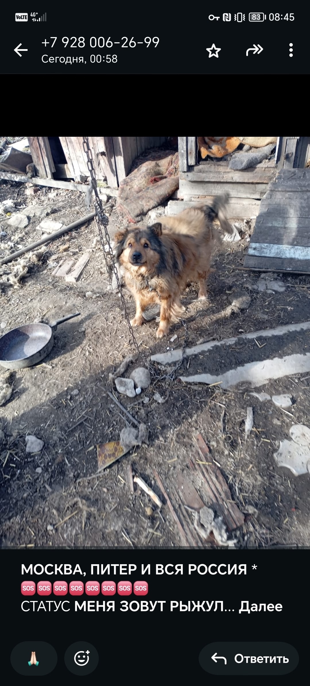 ДРУЗЬЯ, САРАТНИКИ, ВОЛОНТЁРЫ, НЕРАВНОДУШНЫЕ ЛЮДИ , может кто то может облегчить жизнь этой собачки на цепи, она приползла с перерезанным горлом , две женщины помогли , отвезли в клинику, зашили как могли. Она выжила, но сидит на цепи. Она никогда не гуляла на поводке, никогда не было обласканной. Но она так любит людей, не смотря ни на что… Живет Рыжуля на территории заброшенного дома. Там еще 7 щенков, пять взрослых собак и 3 кошечки. СОСЕД СЛОМАЛ ЗАБОР, РАЗБИЛ ЗАМКИ И ТЕПЕРЬ ОНИ ВСЕ В ОПАСНОСТИ. Рыжуля стерилизованная, если захотят ее забрать отвезем к грумеру . Ей около пять лет, очень добрая , ласковая девочка89614936829 Нелля. Находится в г. Ессентуки.
