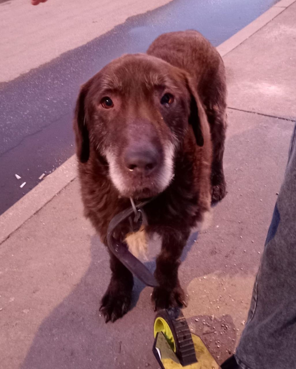 15 марта вечером около дома Вешняковская 41 был замечен пожилой пёс, очередь дружелюбный, в широком кожаном ошейнике с карабином.