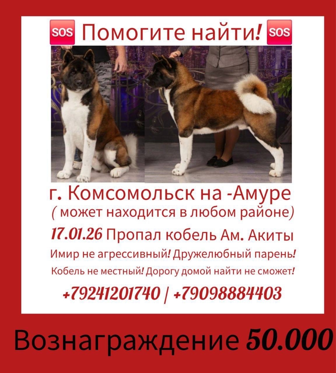 Если видели или увидите, возможно у ваших соседей появилась похожая, взрослая собака, пожалуйста позвоните +79241201740 / +79098884403