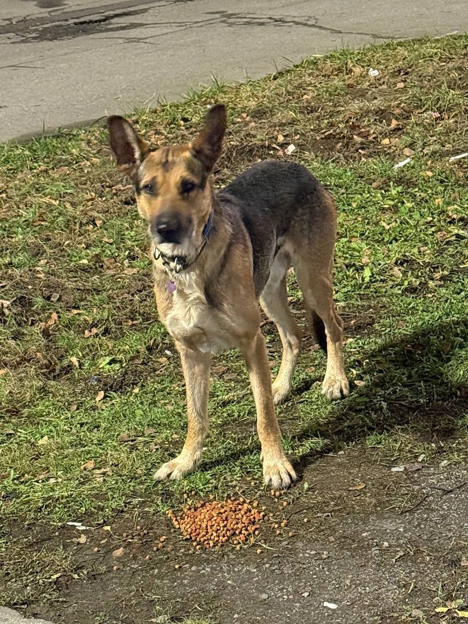 видно, что растеряна, на шее что-то типа адресника в виде сердечка , но рассмотреть невозможно, близко к себе не подпускает, убегает, удалось немного покормить, потом убежала в сторону парковки магазина Ашан (поблизости) ,