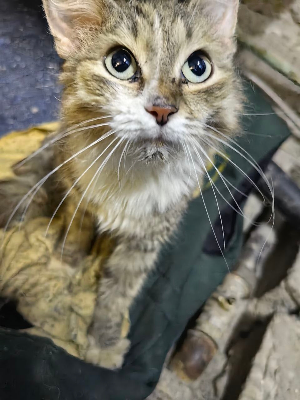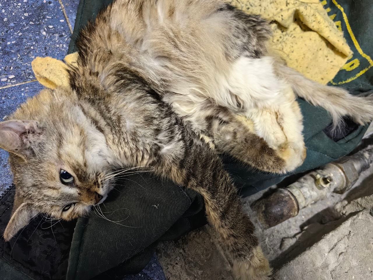 На промзоне прибилась кошка. Вернее отбили от собак. 100% домашняя. Знает то такое лоток. Шерсть чистая. Скол верхнего клыка и ссадина нижней челюсти – явно упала с высоты (с окна или балкона). Состояние, аппетит хорошие, но явно поморозилась и сильно оголодала пока попала к нам – рёбра торчат, но кормим. Что попало не ест – любит влажные корма с пакетиков – скорее всего кормили ими. Собаки вроде сильно не потрепали. Ласковая, на руки просится – явно домашняя. 31 декабря предприятие закроется на новогодние каникулы, кормить некому, отопления не будет, да и начальство против. Скорее всего отвезём в подвал какого-нибудь жилого дома где хотя бы тепло и нет собак. Ищем хозяев срочно.