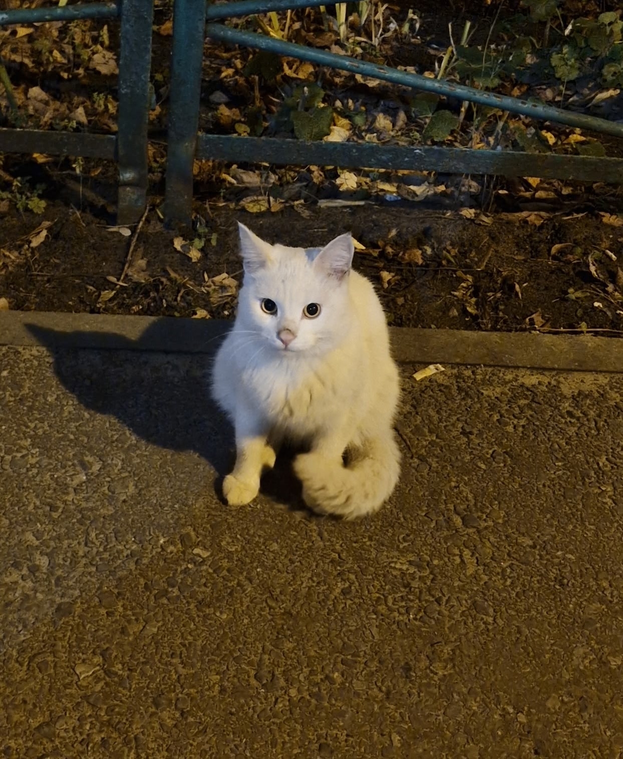 На ул. Фурманова – 8 Марта белый кот бегает за людьми. Несколько дней его не было видно, сегодня опять появился, очень голодный.