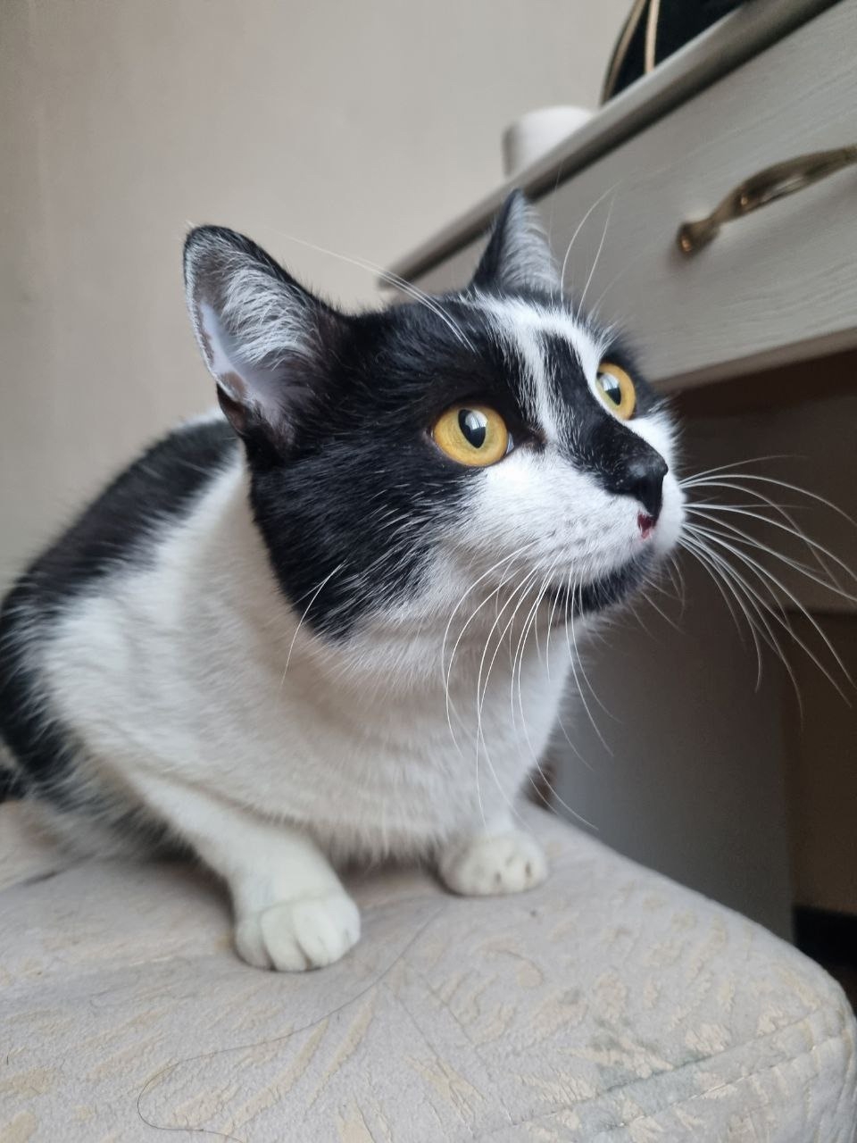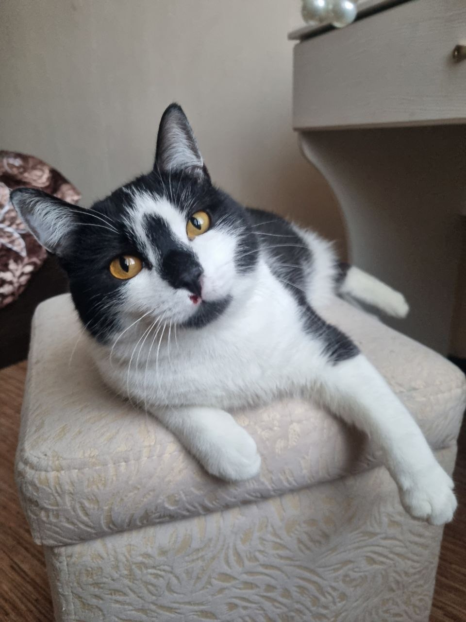 Упитан и кастрирован. По виду потерялся совсем недавно – был чистым, но кто-то успел поцарапать ему под носиком.