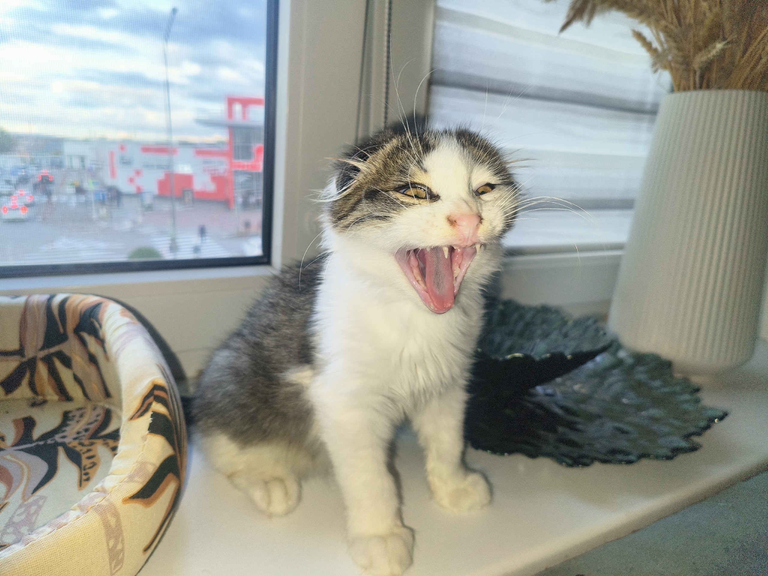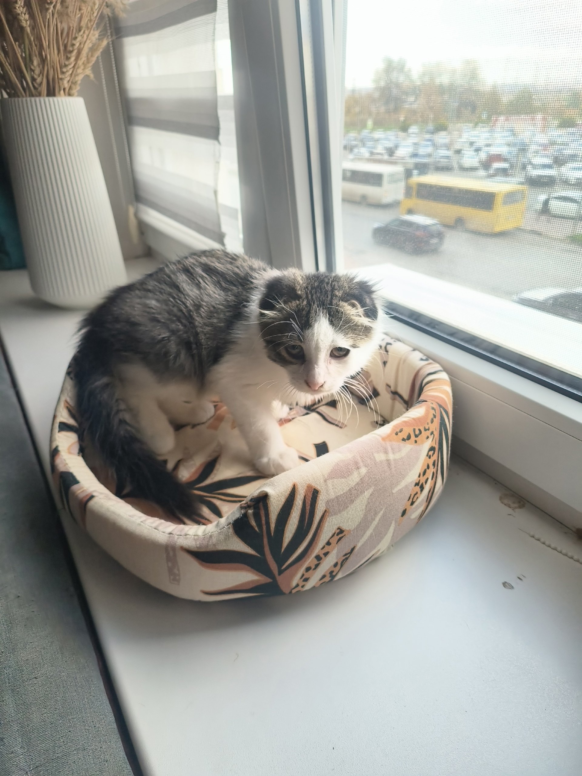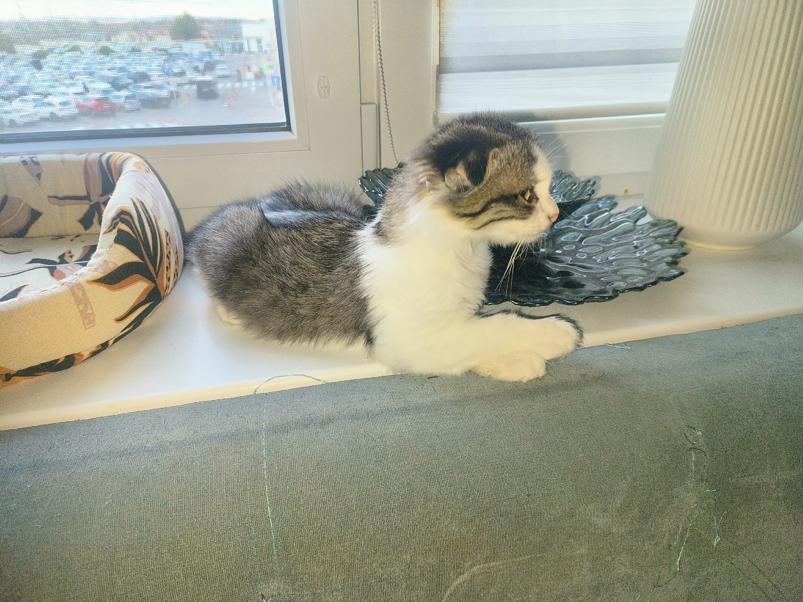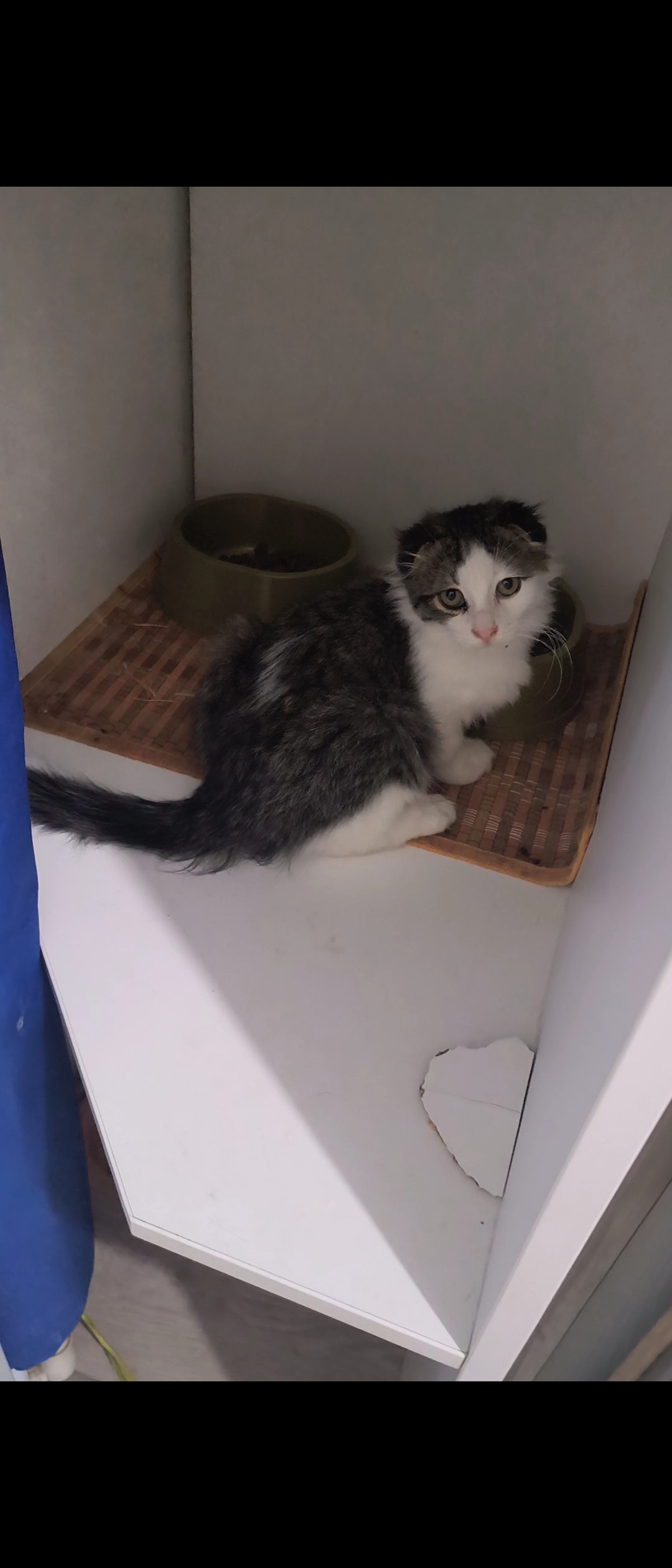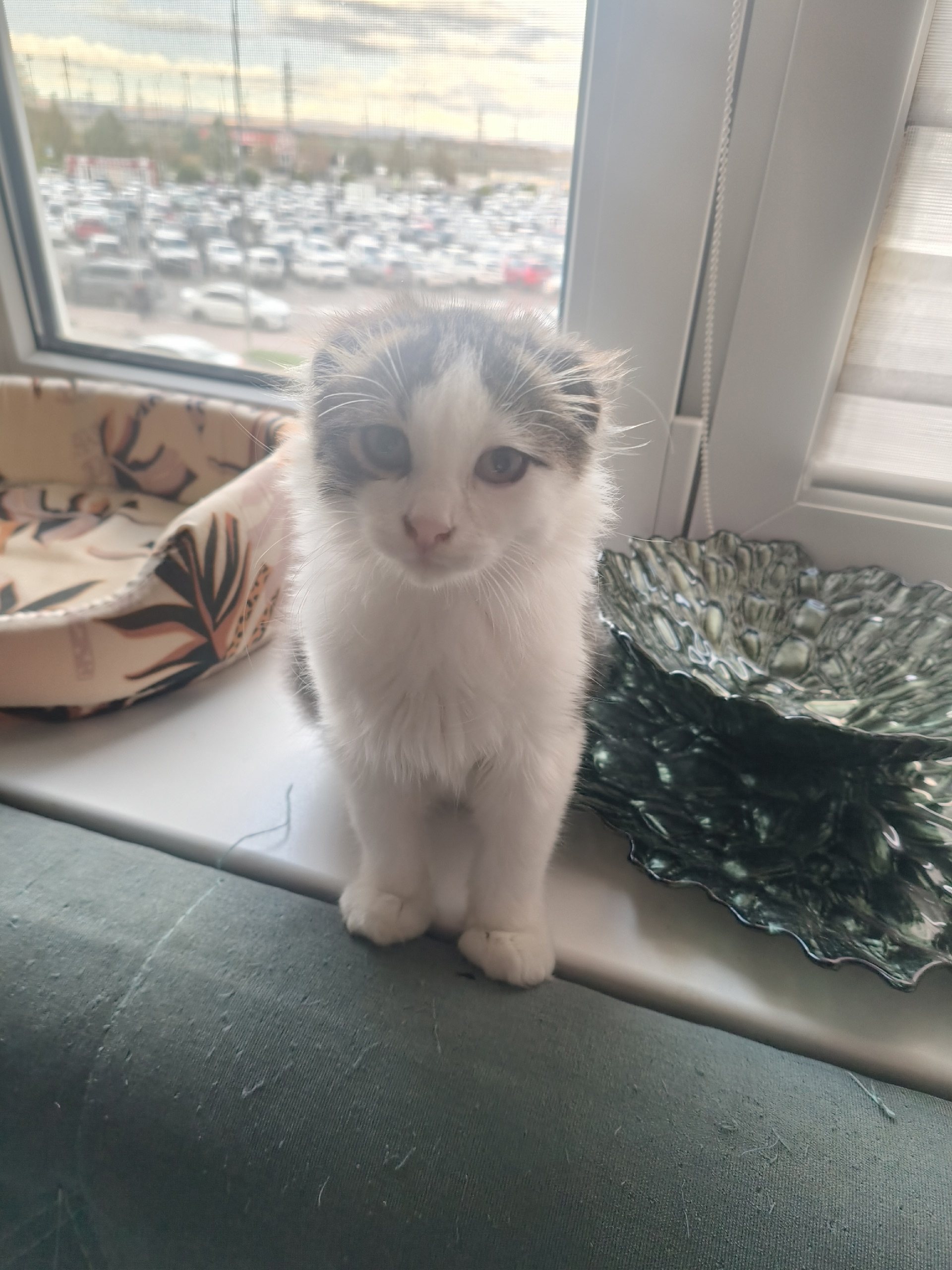 Найден маленький котик,в районе Объездная 39,вислоушка,забрали на передержку,обработали,укоротили ноготки без паники и царапок,кушает всё,в туалет сразу в положение место.Месяца три максимум.Ищем добрые ответственные руки и сердце.89189845971 звоните если ищете очень тактильного котика.