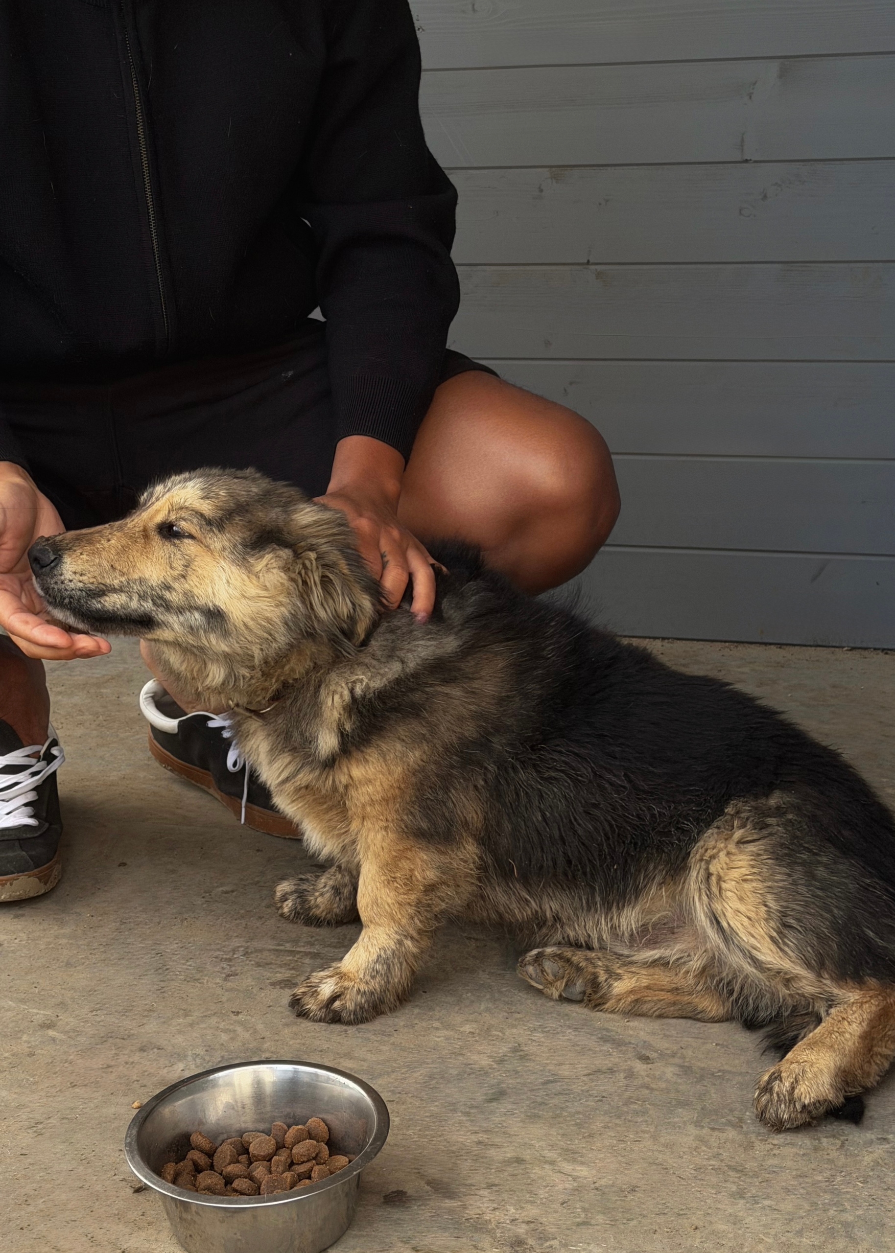 Окрас чёрно-подпалый, внешне похож на метиса овчарки.