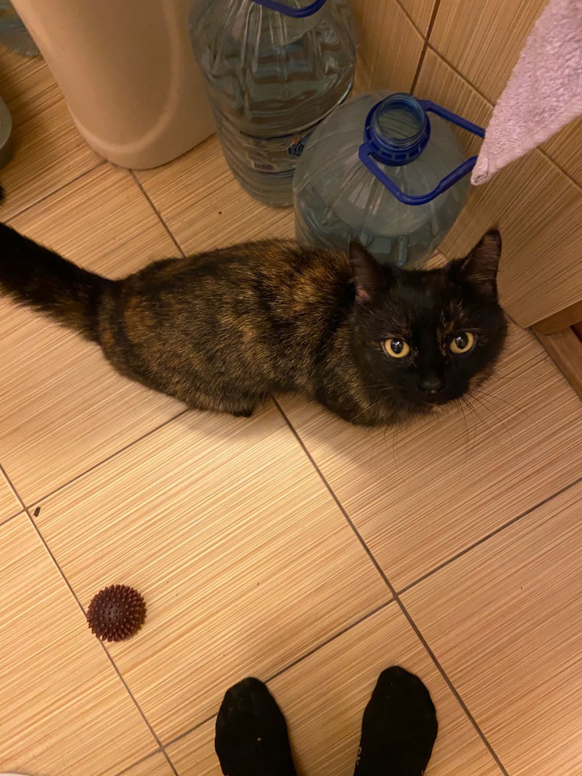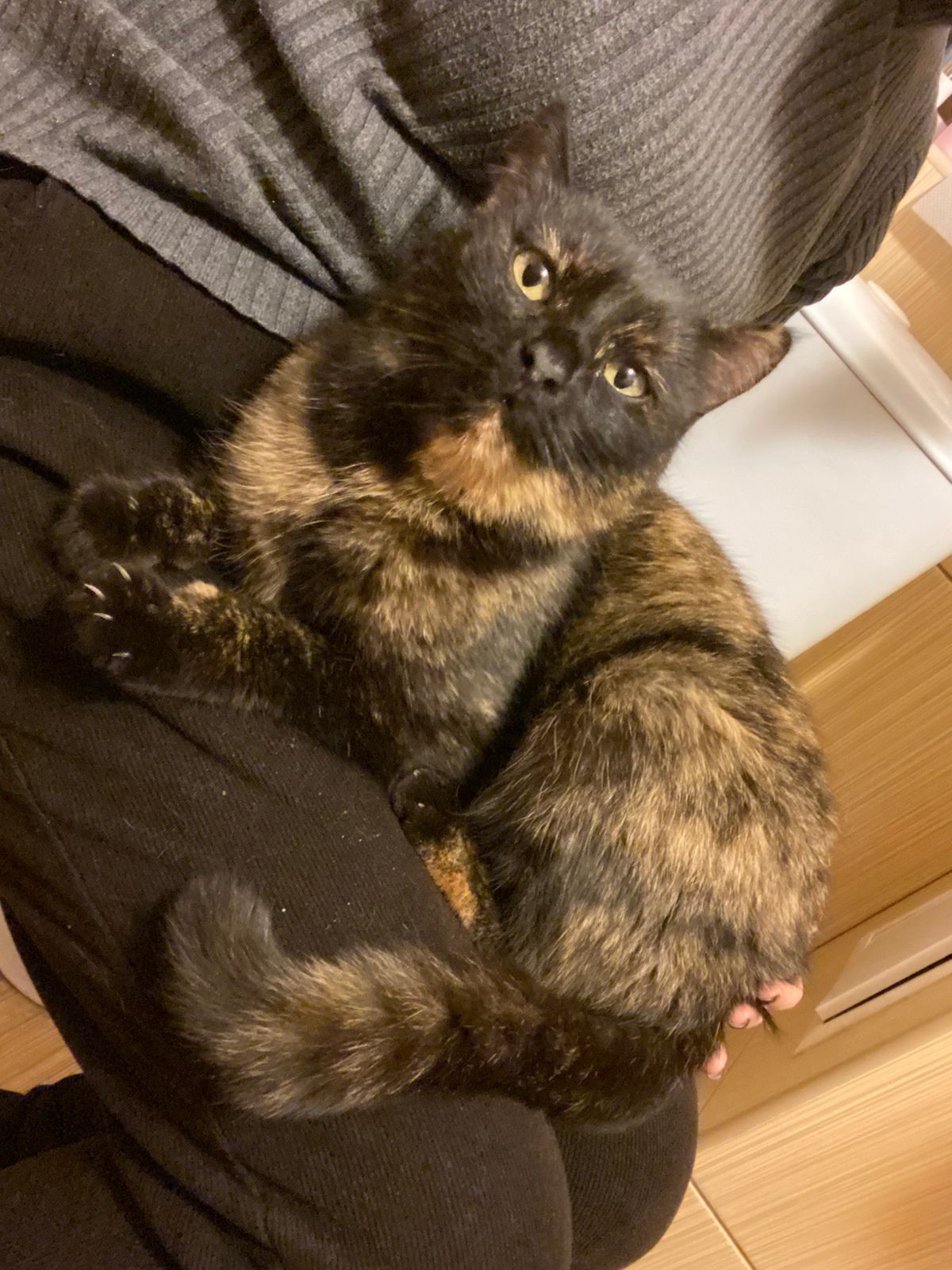 Бродила под окнами , подбегала к людям и заглядывала всем в глаза. Очень долго и громко мяукала. Неравнодушные люди забрали временно к себе домой. Кошка очень ласковая, контактная, знает лоток.