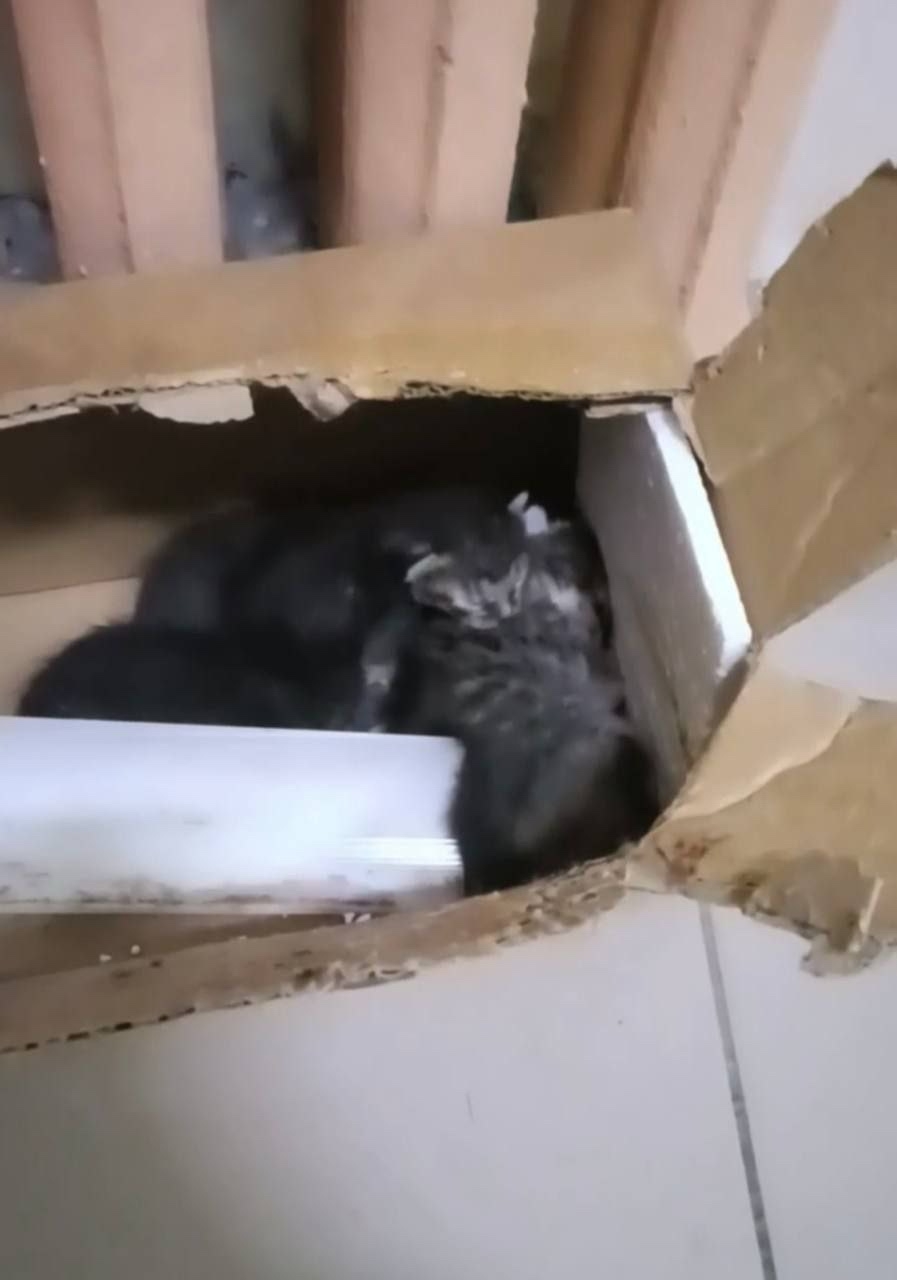 Кто-то выставил во в подъезде коробку с тремя котятами. Они совсем крошки.