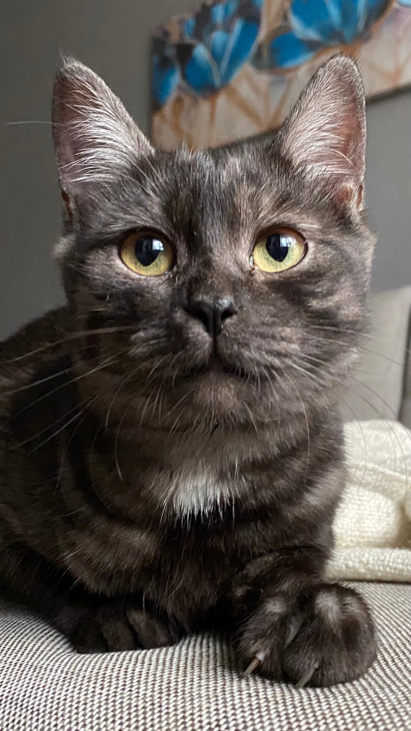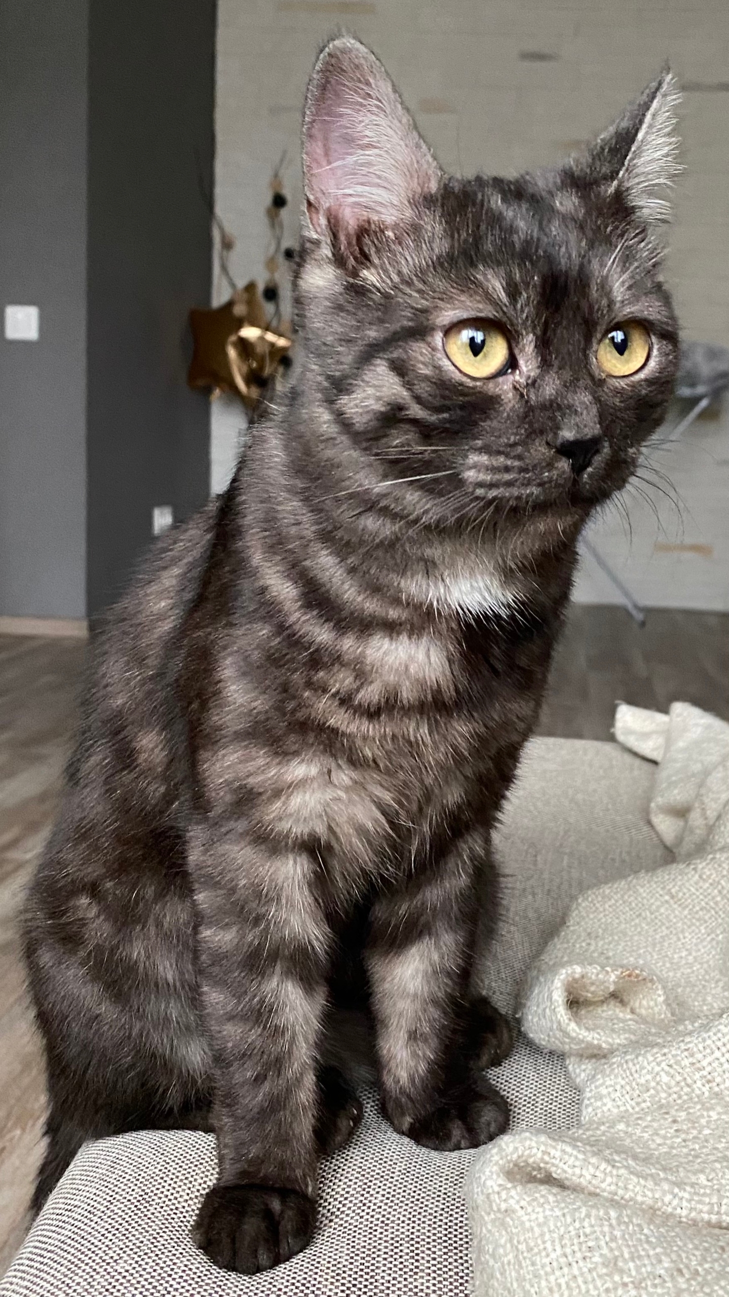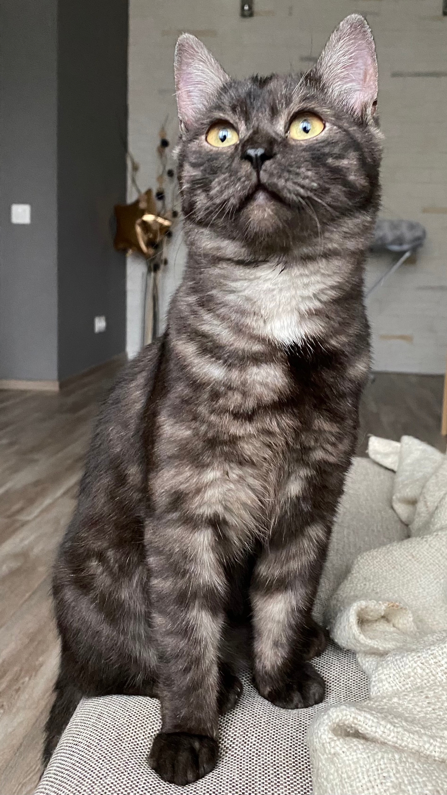 Окрас серый мраморный с белым подшерстком, похожа на шотландскую. Невероятно ласковая и непрерывно урчит.