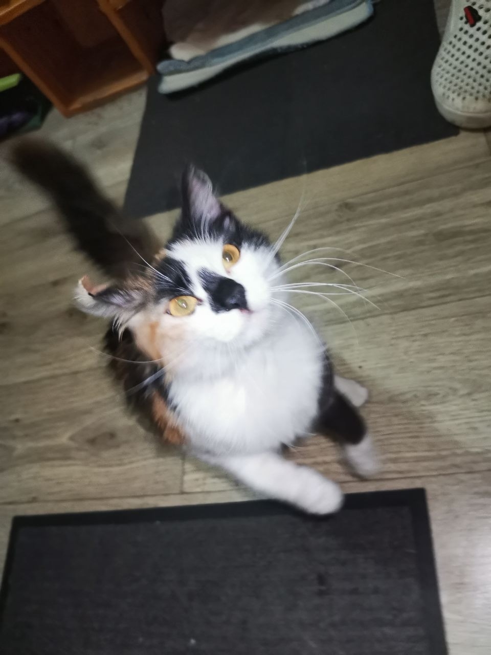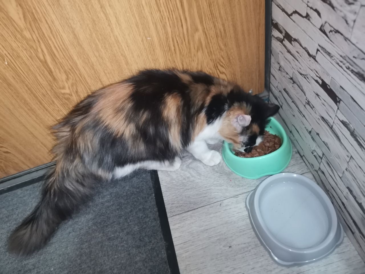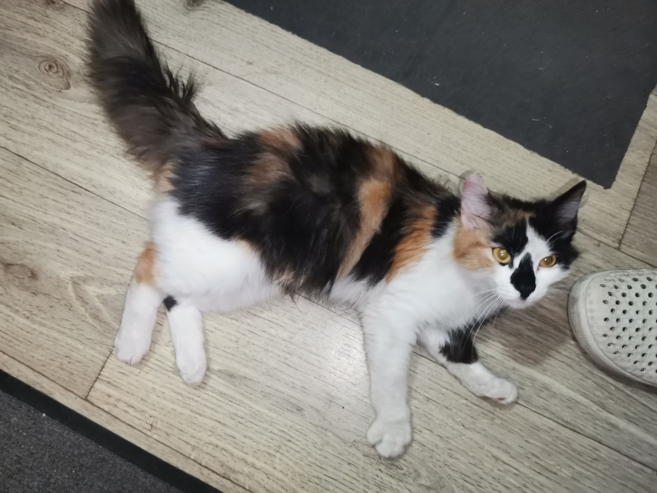Найдена молодая трехцветная кошечка в районе улицы Проспект Ермака 36, недалеко от пвз Озон. На кошечке был чёрный ошейник. Просим откликнуться хозяев или тех, кто может забрать её в эти морозы