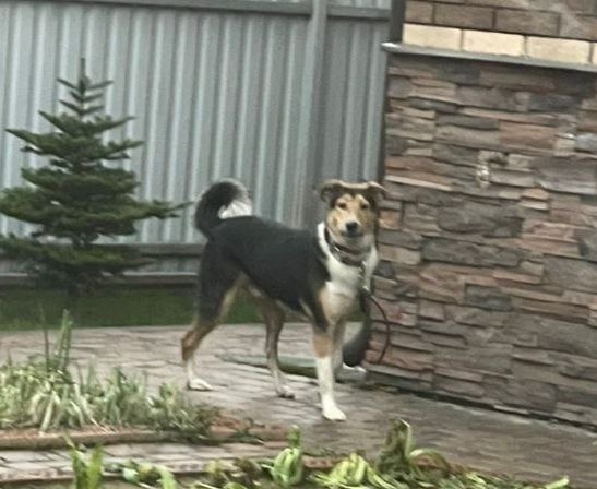 Кобель, беспородный, окрас чернобелый с бежевым, есть ошейник и оборванный поводок.