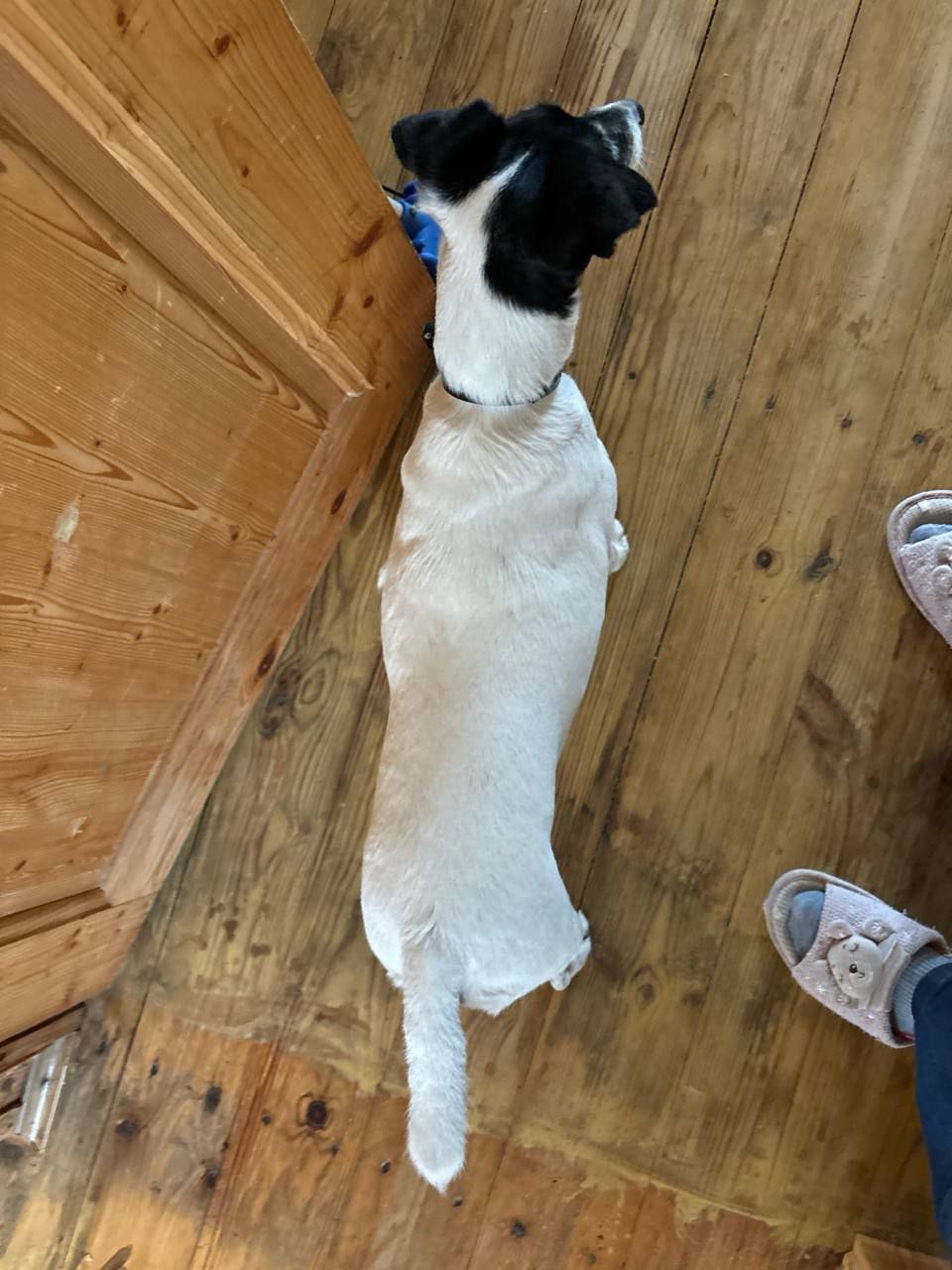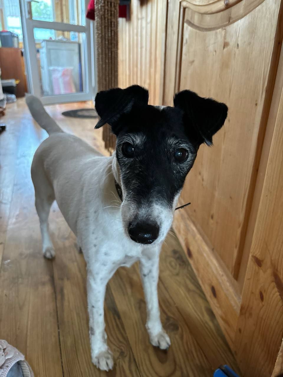 Гладкошерстный фокстерьер белый с черным в ошейнике
