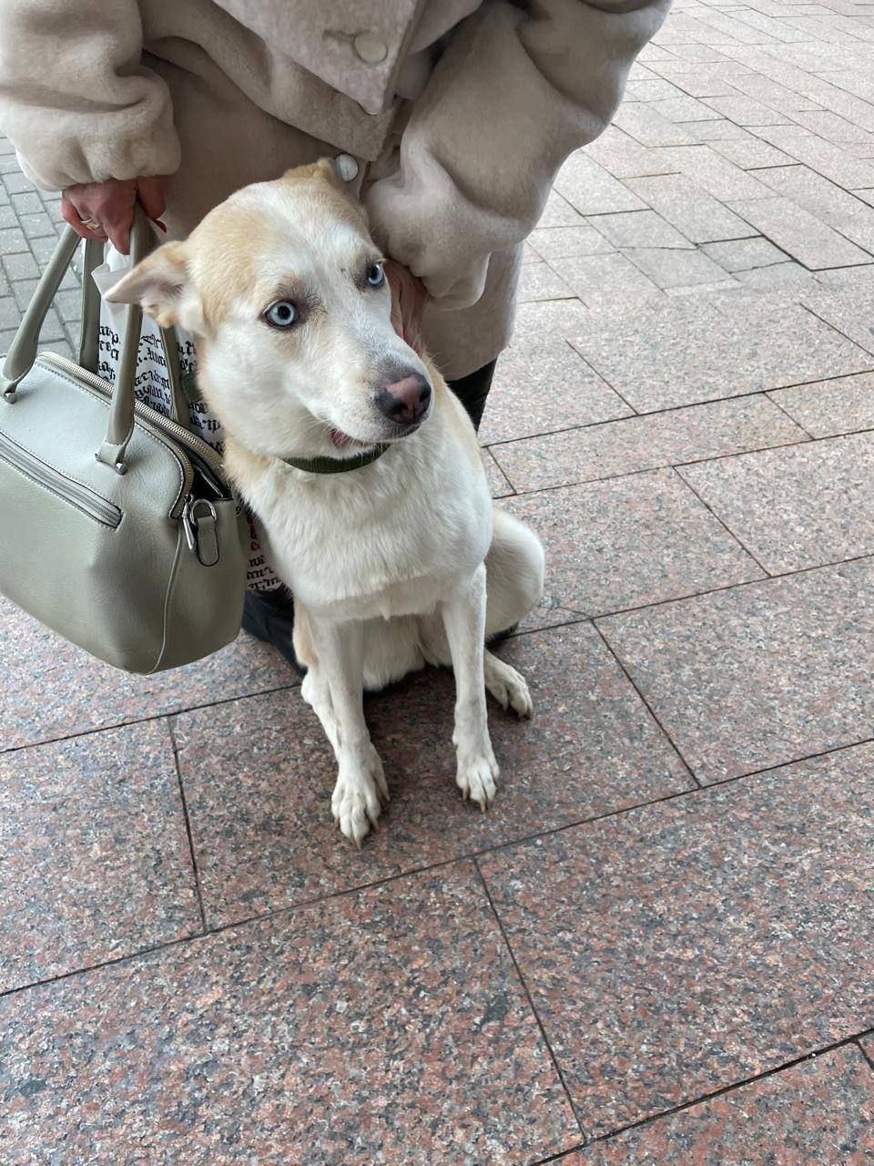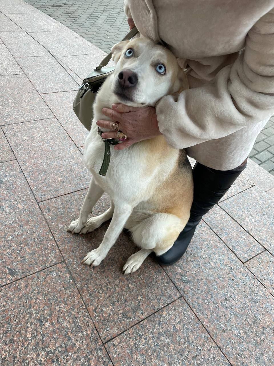 Собака с ошейником бегает по вагонам, ищет хозяина, глаза голубого цвета, бежевого цвета с рыжей спинкой, с зеленым ошейником