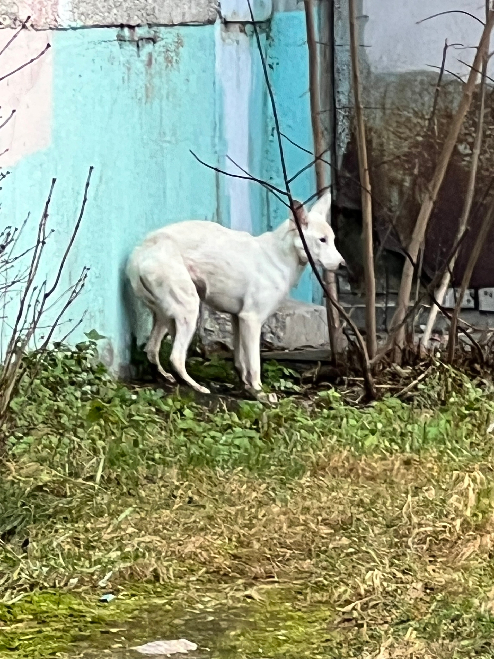 Найдена собака! Бегает белая гладкошерстная собака с большими стоячими ушами. Худющая. Голодная.