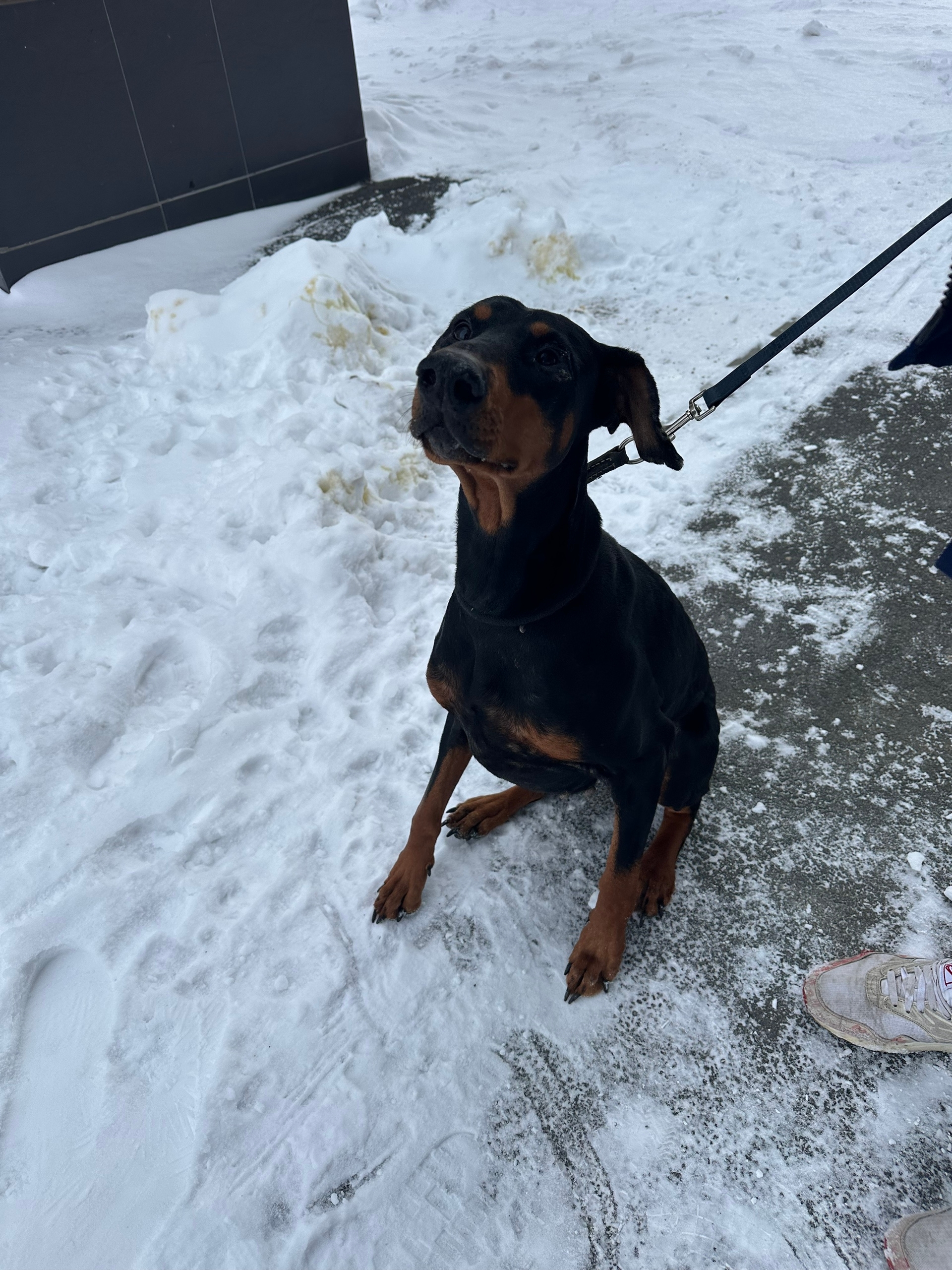 Найдена собака, доберман, сука. 02.01.2026 на улице Блюхера. В данный момент находится на ул. Блюхера. Забрали домой, но долго держать у себя не сможем. Собака воспитана но очень испуганна. Была в ошейнике.