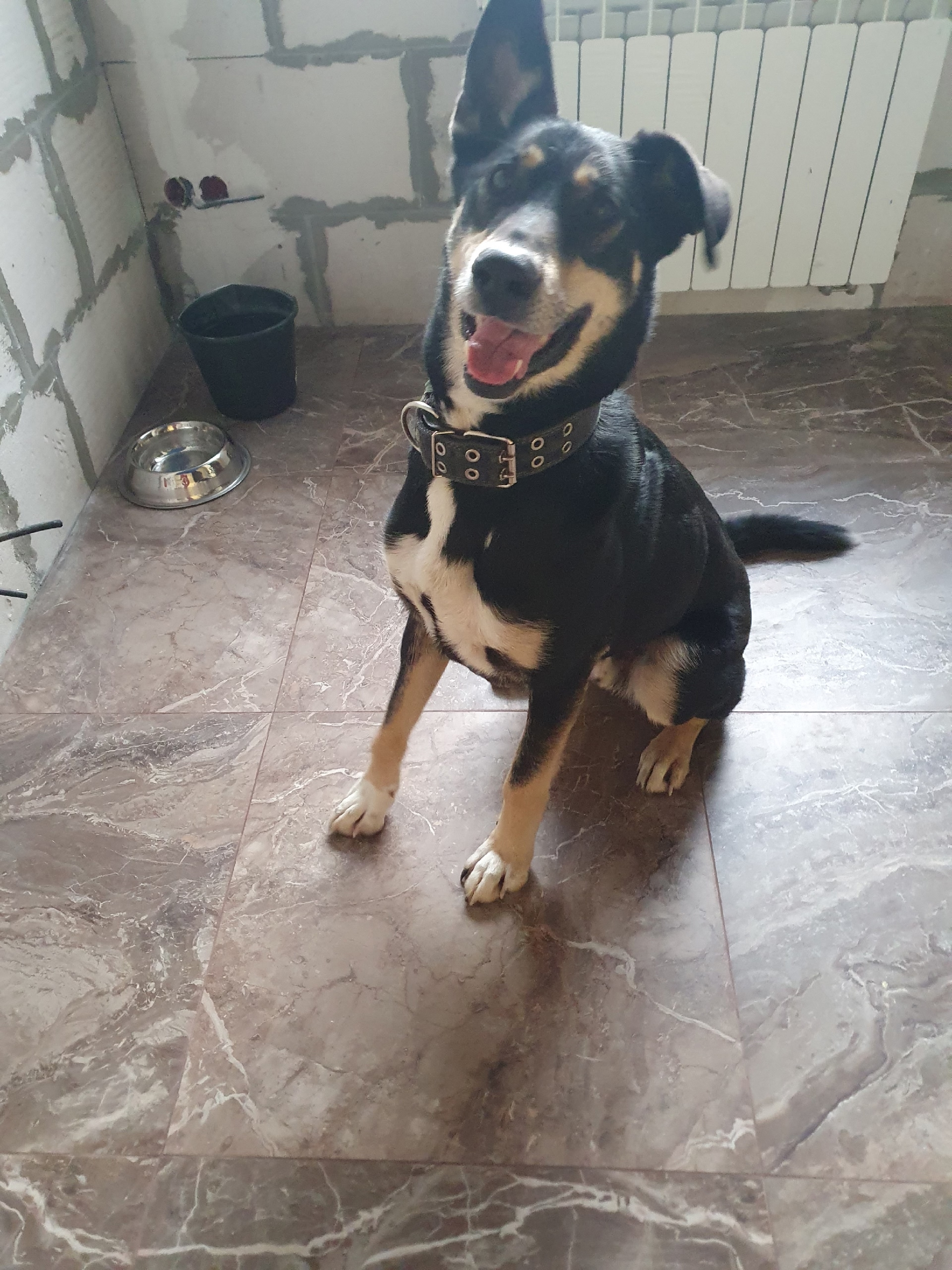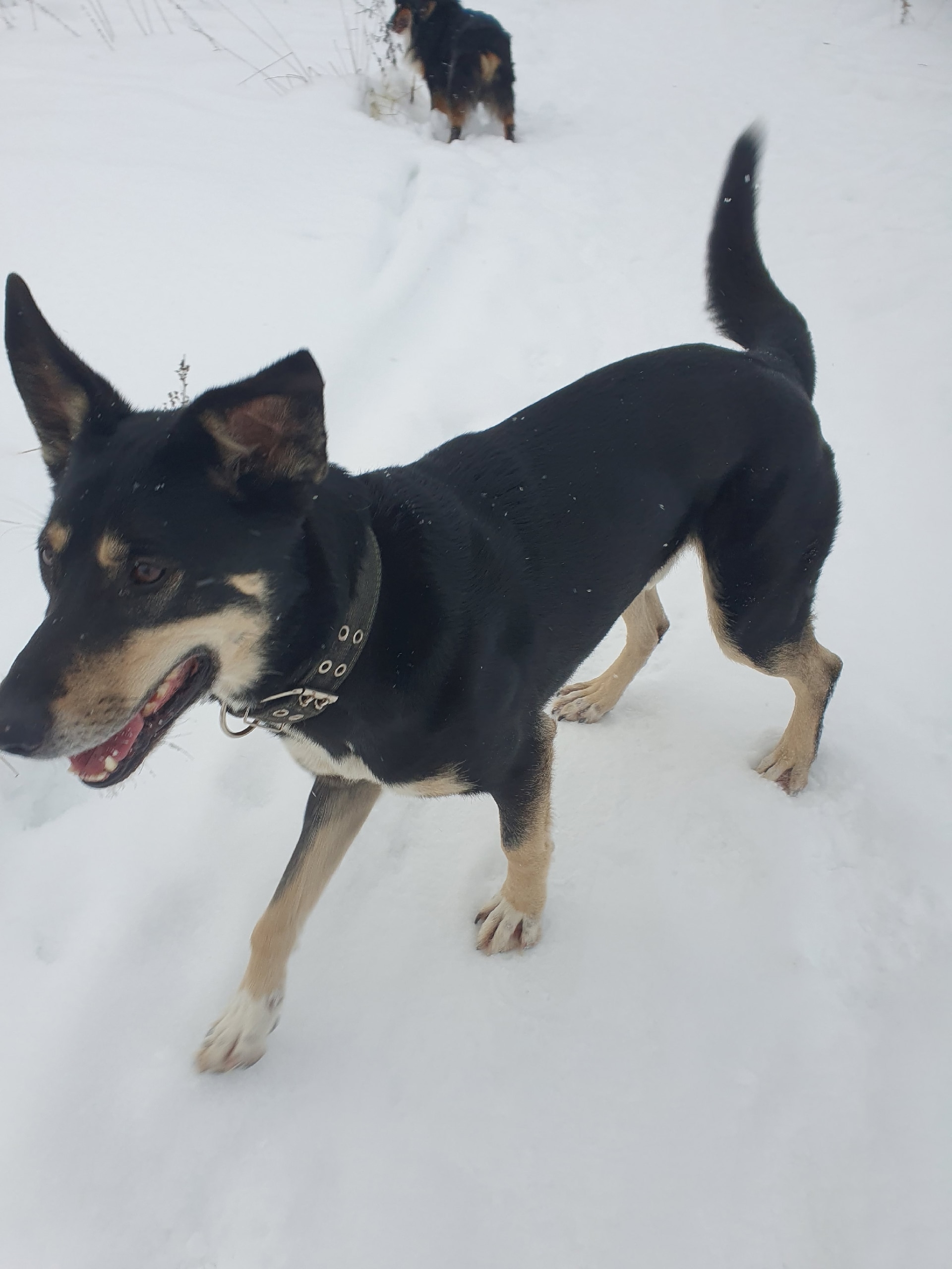 Кабель. Рост примерно 55 см в холке. Окрас черный с подпалинами на груди, морде, лапах. Одно ухо висит, другое стоит. Худощавый, короткошерстный. В ошейнике. Доброжелательный, домашний. Ладит с людми и собаками. Чистый. Знает команды: сидеть, дай лапу, иди сюда.