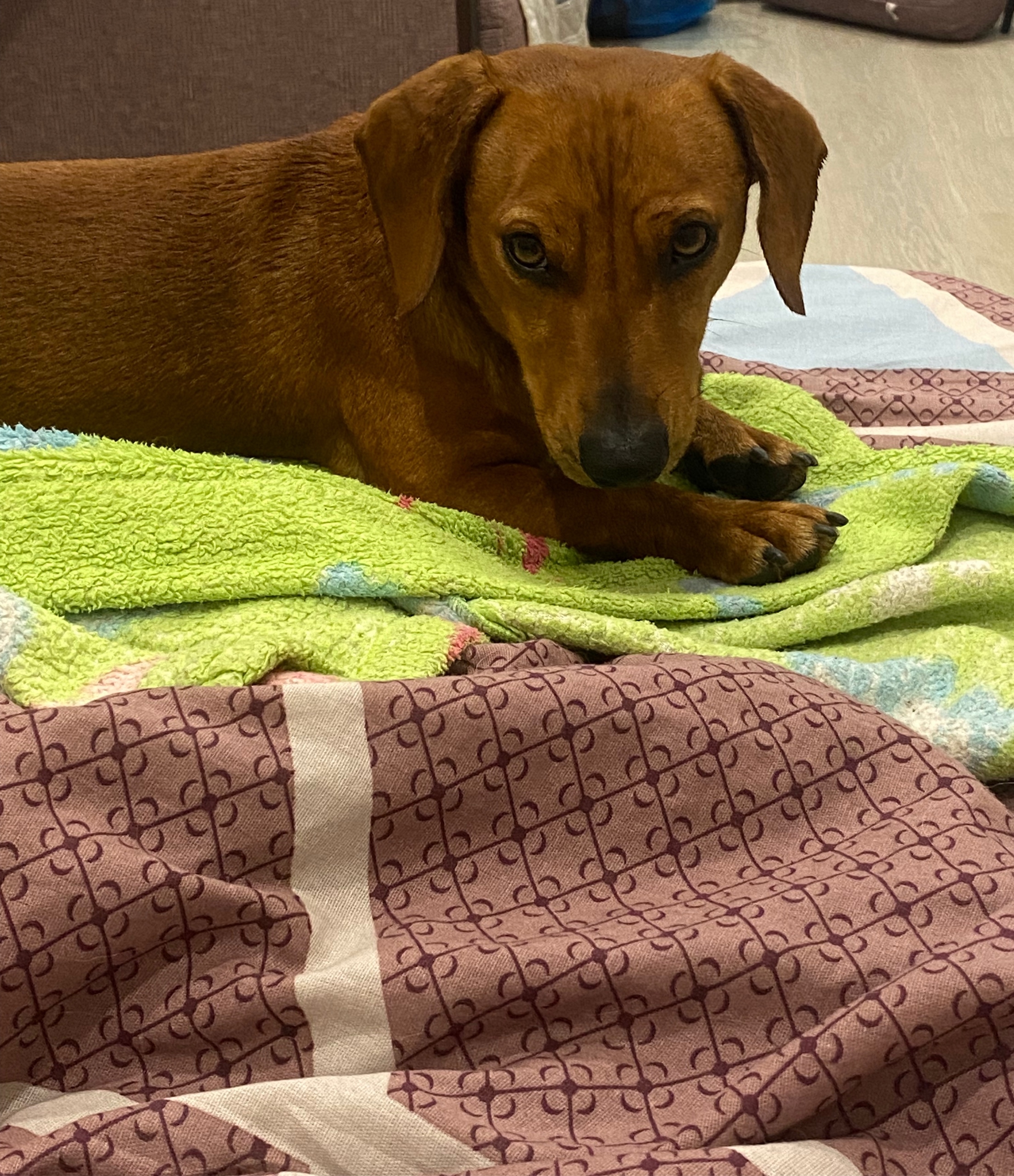 Ходит в туалет на улицу, с другими собаками ладит, спит под одеялом в обнимку