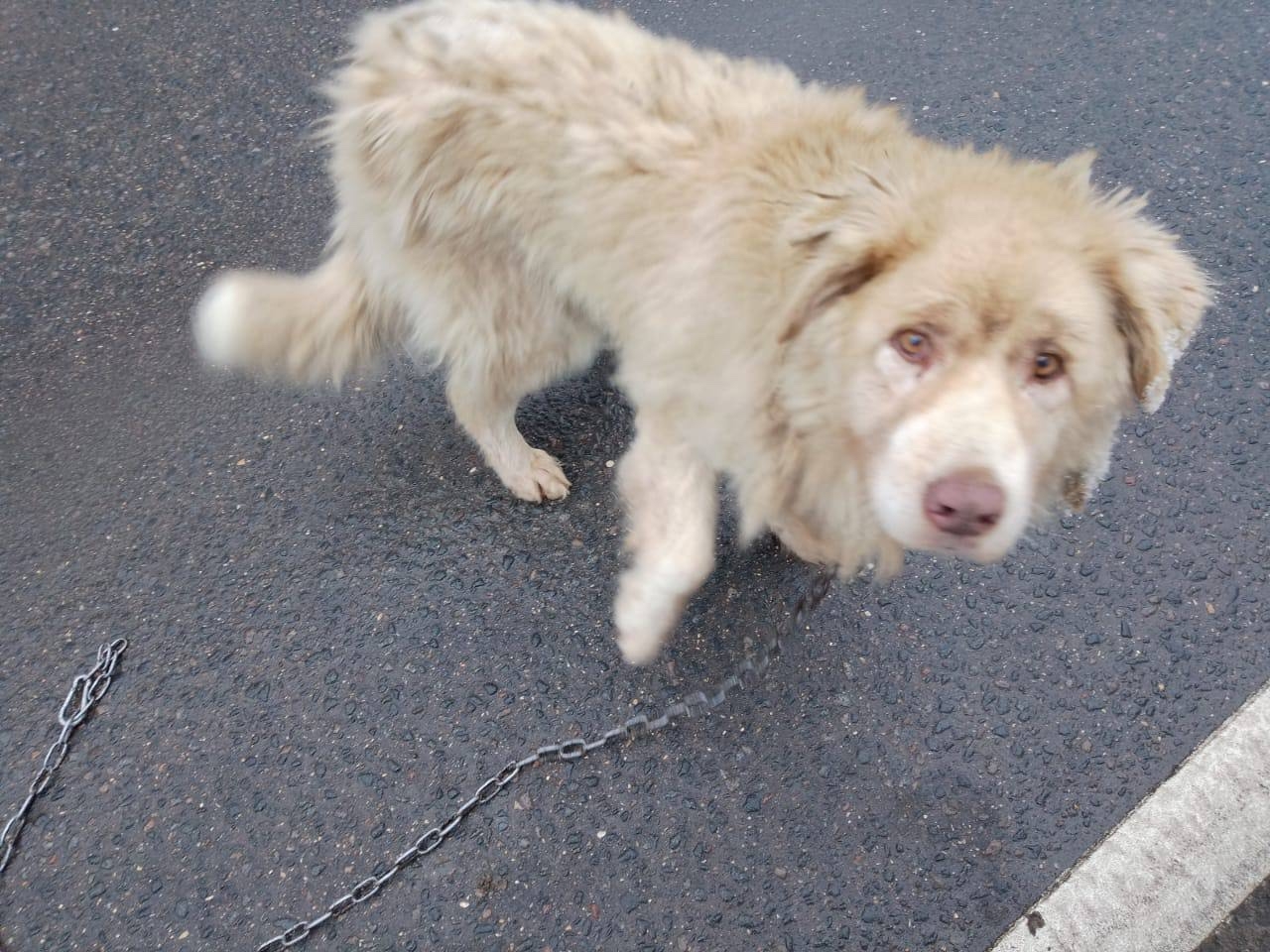 В деревне Селятино (по улице Шоссейная) встречен пёс: голодный, задняя лапка подмерзла, глаза красные, за ним тянется кусок цепи, очень добрый…