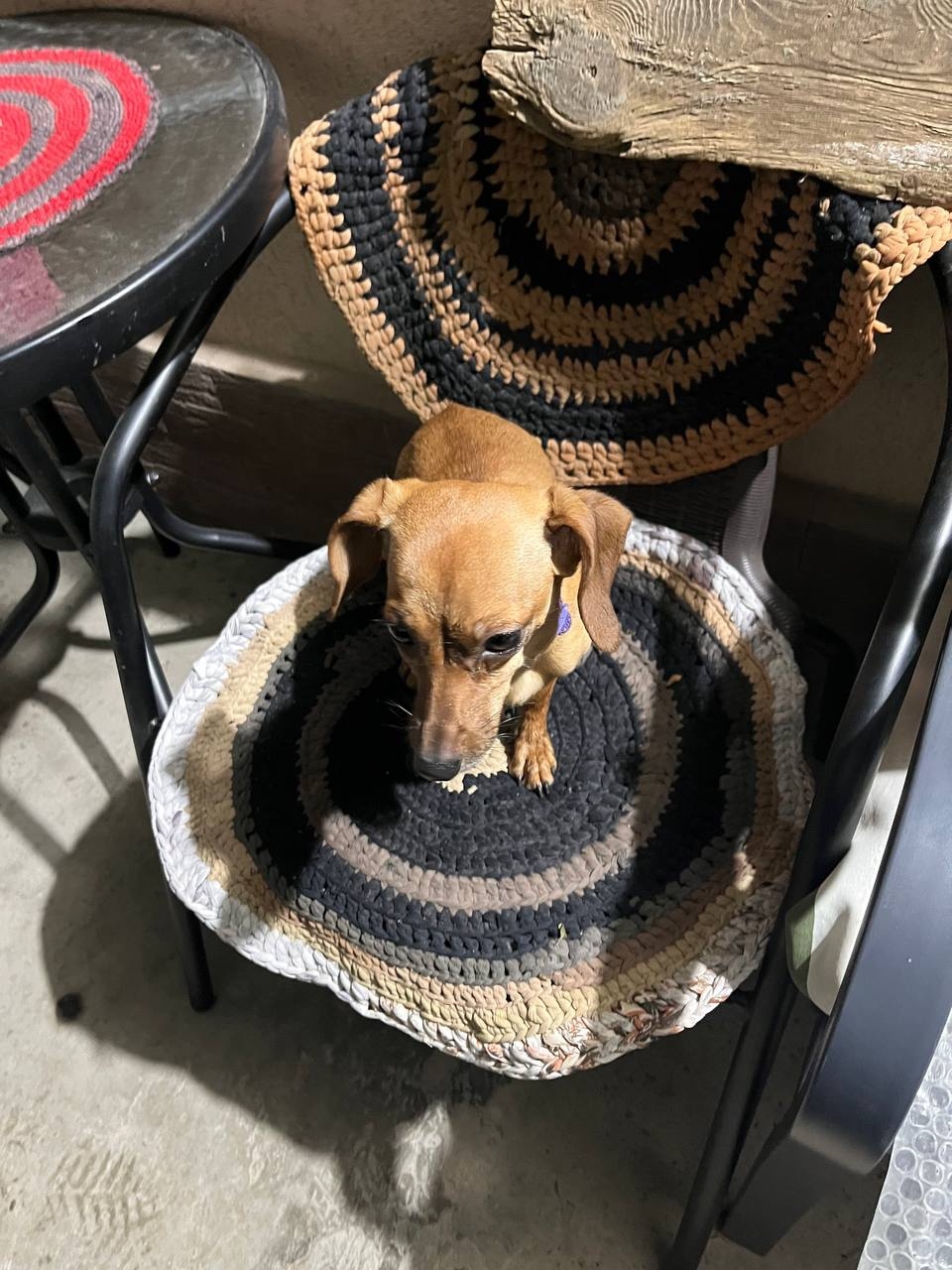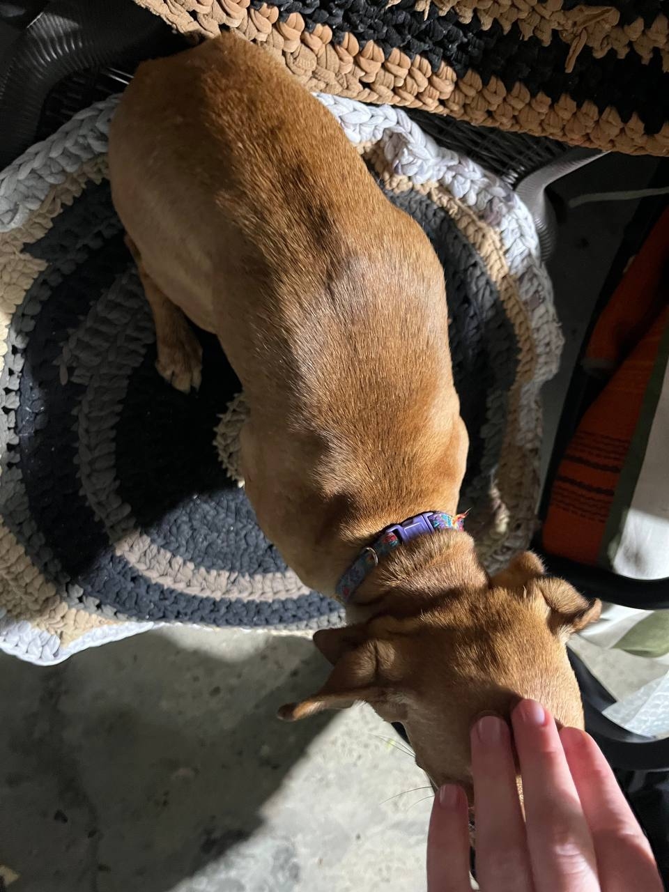 Маленькая собачка, рыжего цвета, сама забежала во двор, с ошейником (но там нет никакой информации о хозяевах).