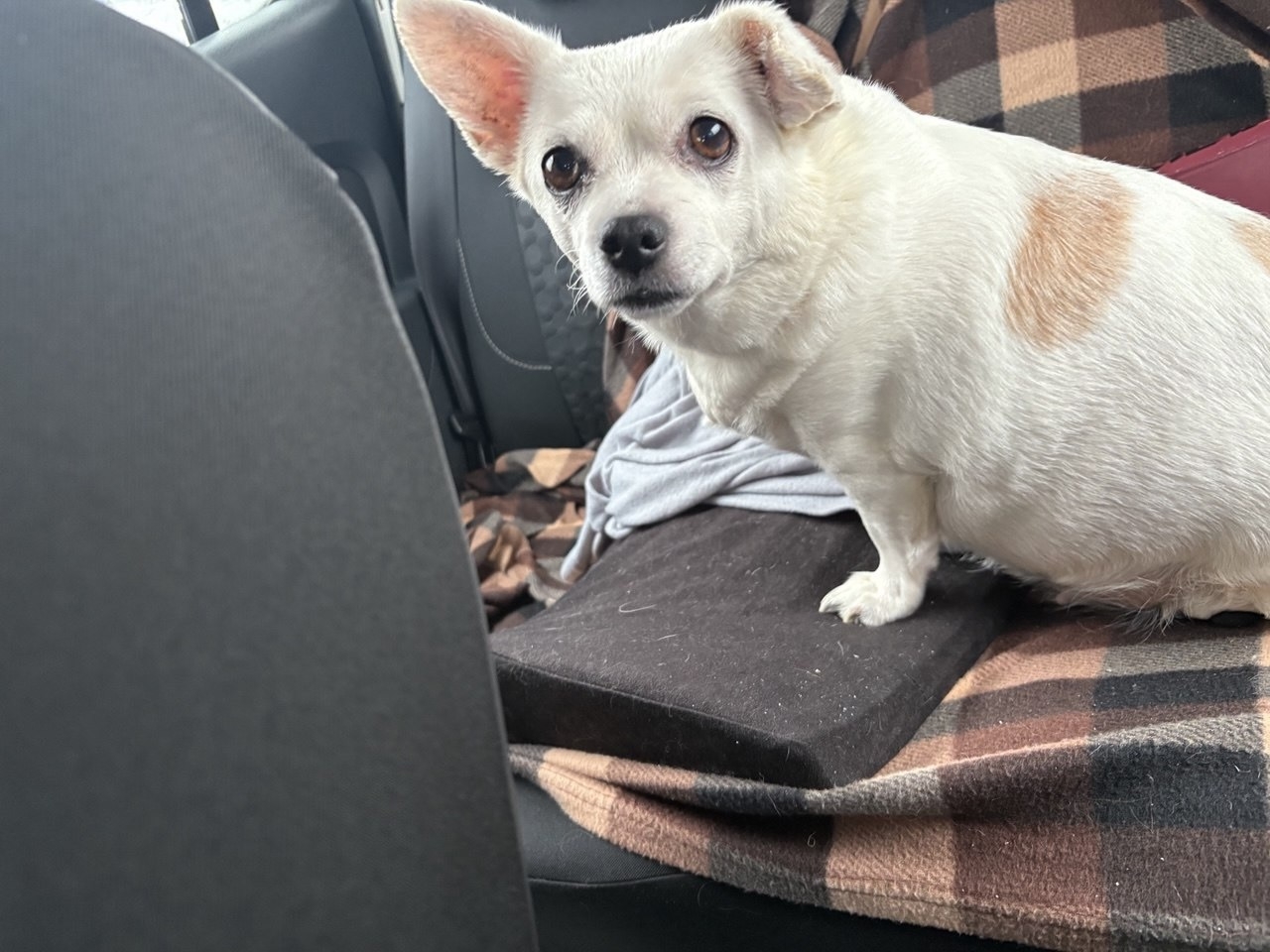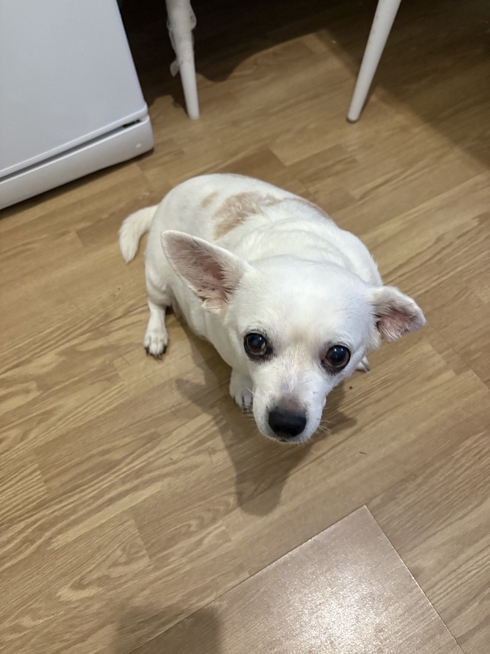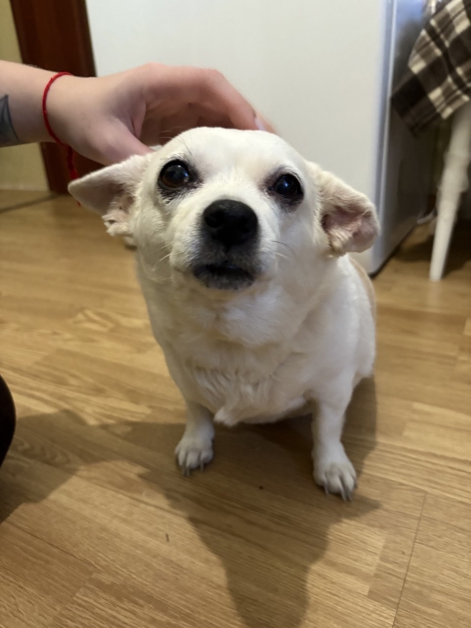 Нашли 4.01.2026 в районе Аэродрома собаку (девочка), похожа на чихуахуа, белая, на спине коричневые пятна, очень крупная!