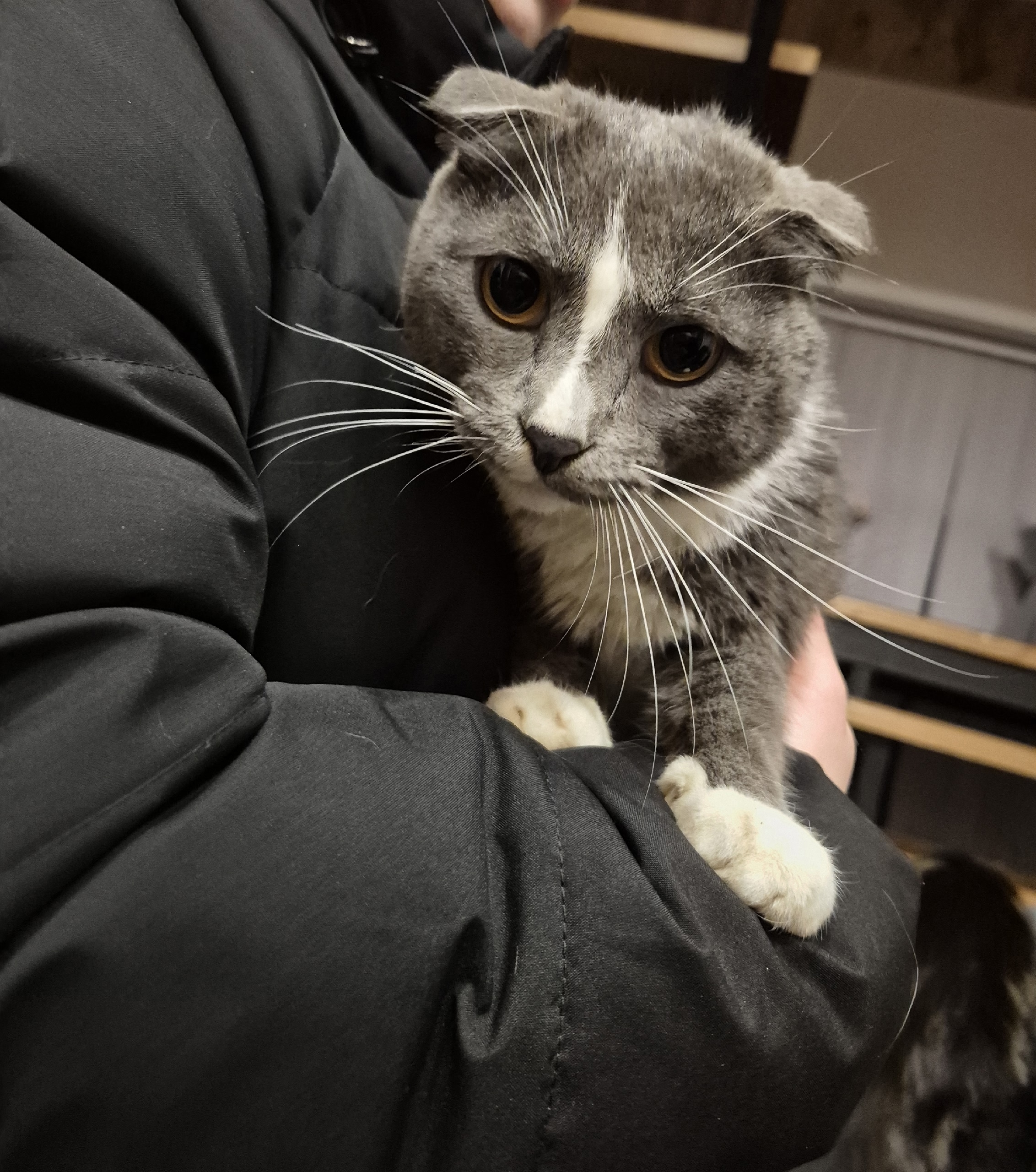 Нашли домашнего кота в районе Малинского шоссе, точнее у Кантри. Мяукал и очень боялся. Котик очень ласковый. Взяли на передержку.