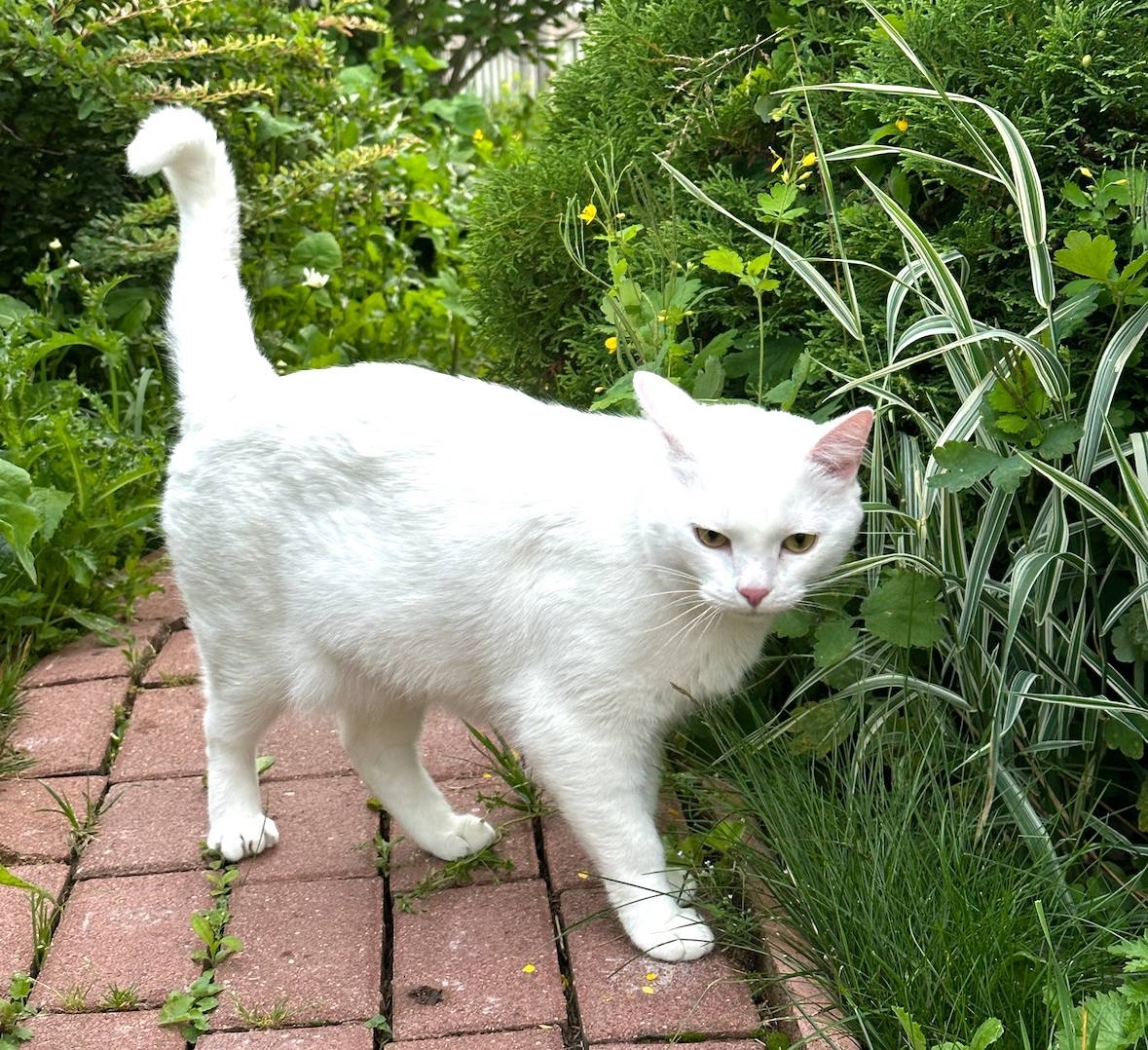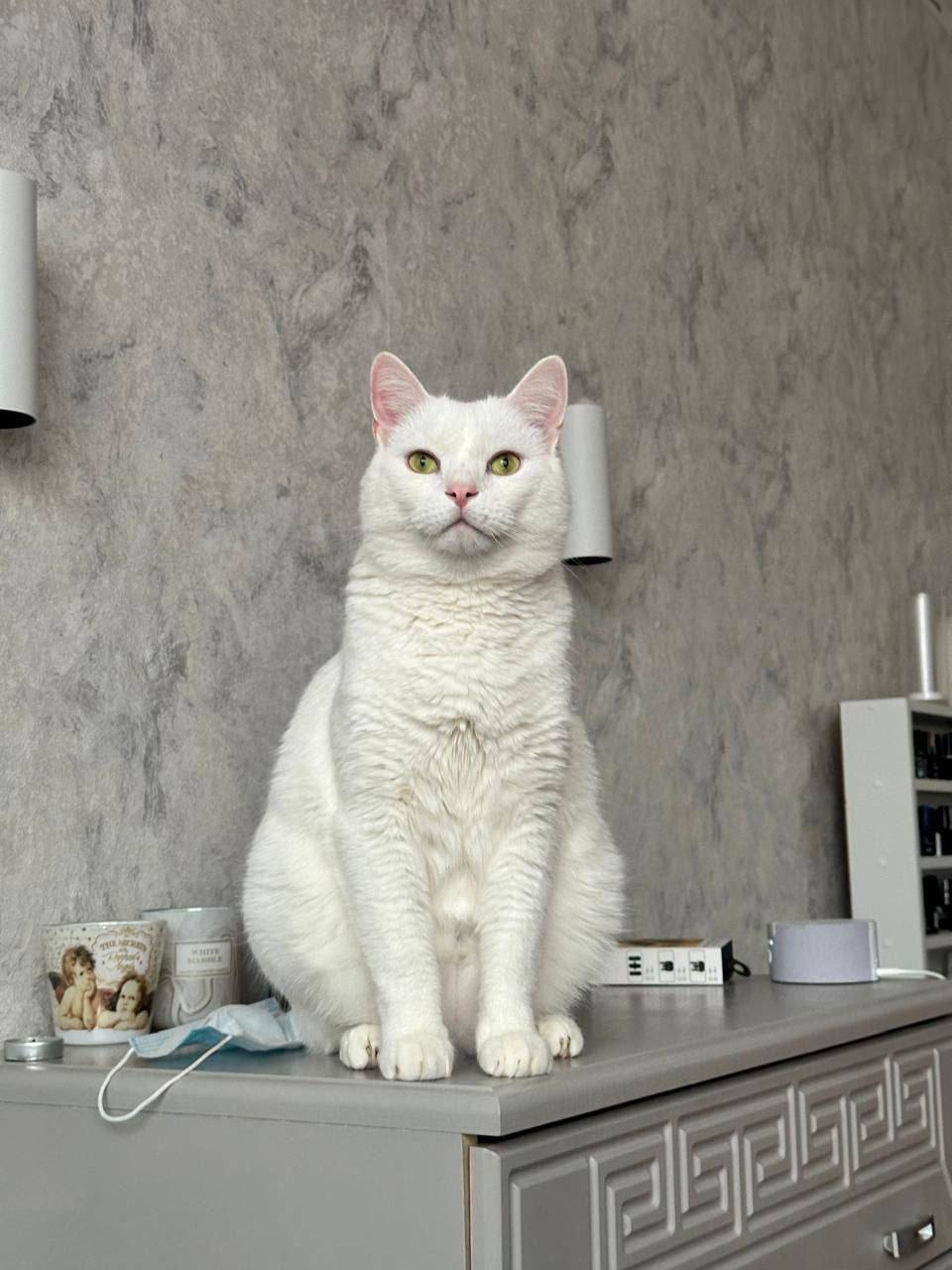 Полностью белый кот, крупного телосложения, глаза зеленые