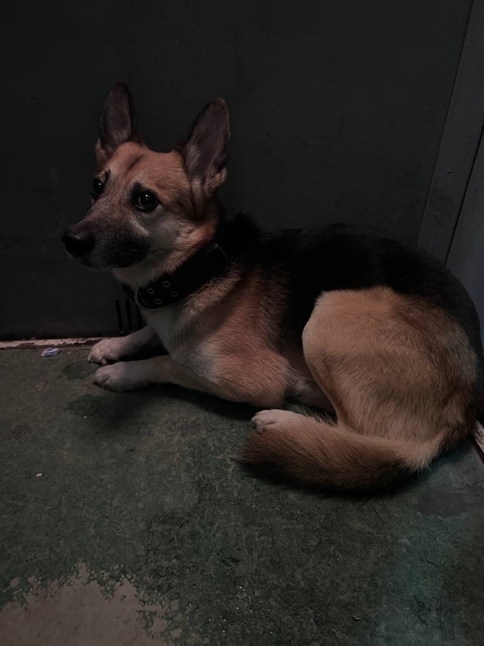 Новлянск, собака забежала в подъезд, затем в лифт. Забилась в тамбуре между квартирами. Чей потеряшка? Молодой, от еды и воды отказывается. Трясется, видимо убежал из-за салюта. Но как попал в подъезд-загадка