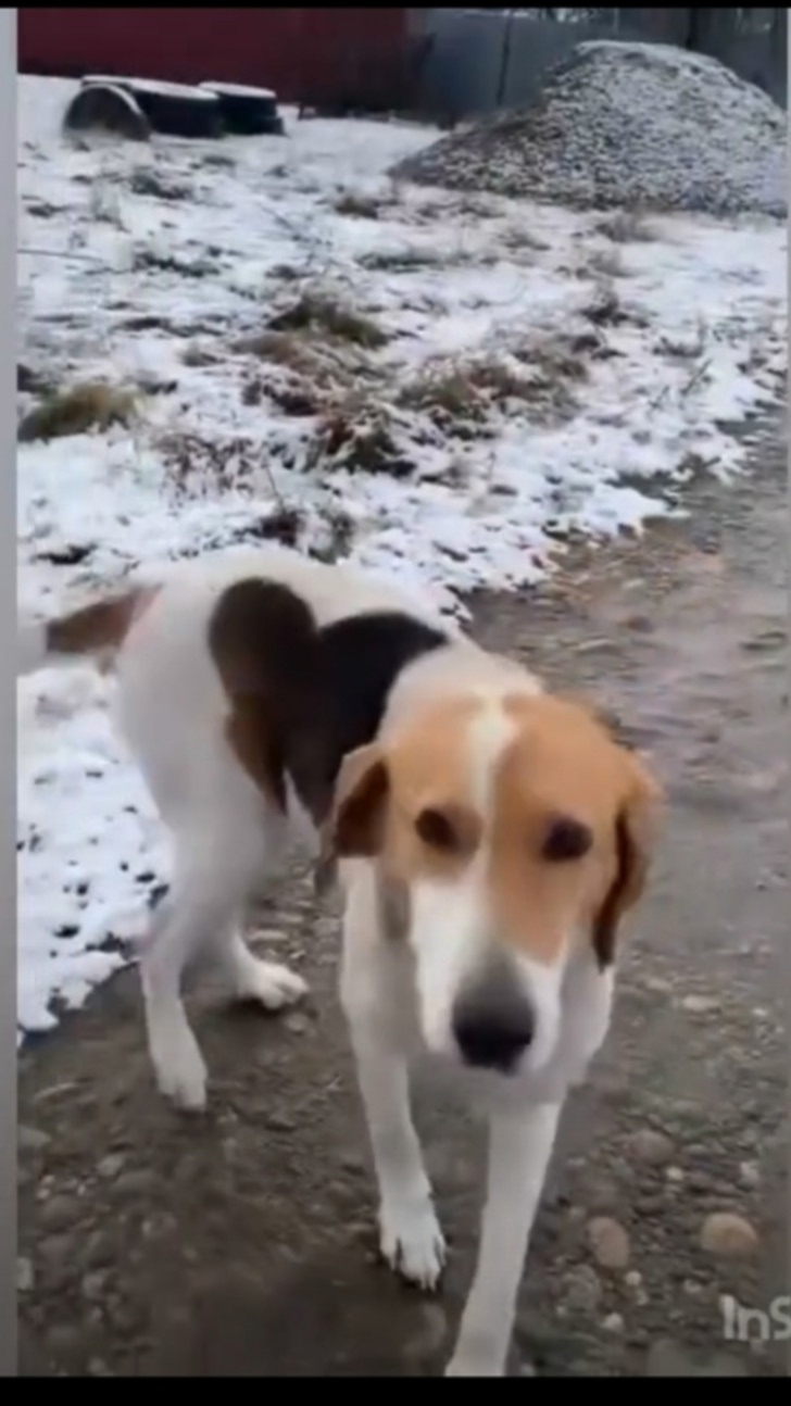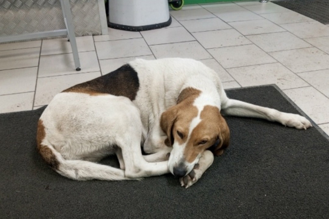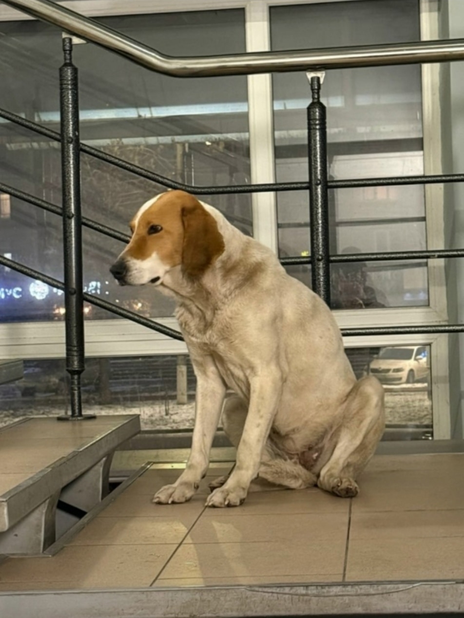 Крупная собака, порода вероятно Русская пегая гончая, девочка, абсолютно мирная. Ходит по центру города, здесь ей долго не прожить! Как выяснилось она какое-то время жила на дачах, где её бросил хозяин. Наступила зима и видимо холод и голод вынудили её пойти в город, к людям. К людям за помощью. Но наше население в массе своей ненавидит собак. А эта собака слишком крупная и приметная. Ей негде спрятаться от людской злобы, а также от мороза. Она заходит в магазины и доверчиво ложится на пороге, она совершенно беззащитна!