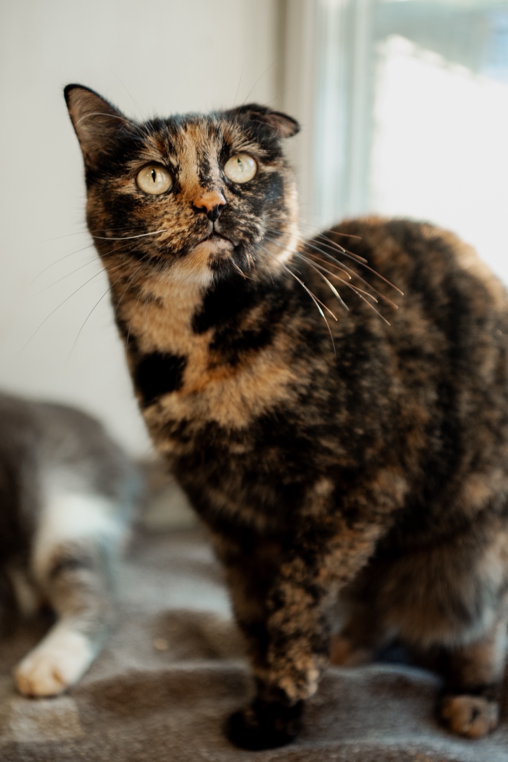 Очень умная, боязливая, аккуратная с общением, любит когда с ней разговаривают- очень внимательно слушает.