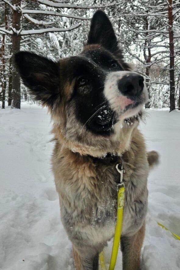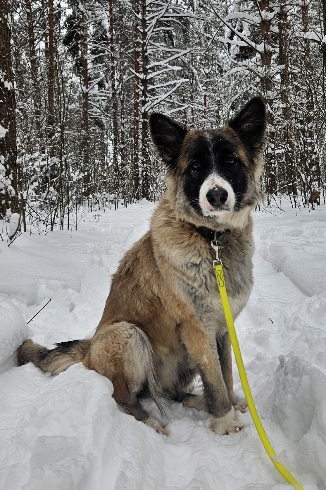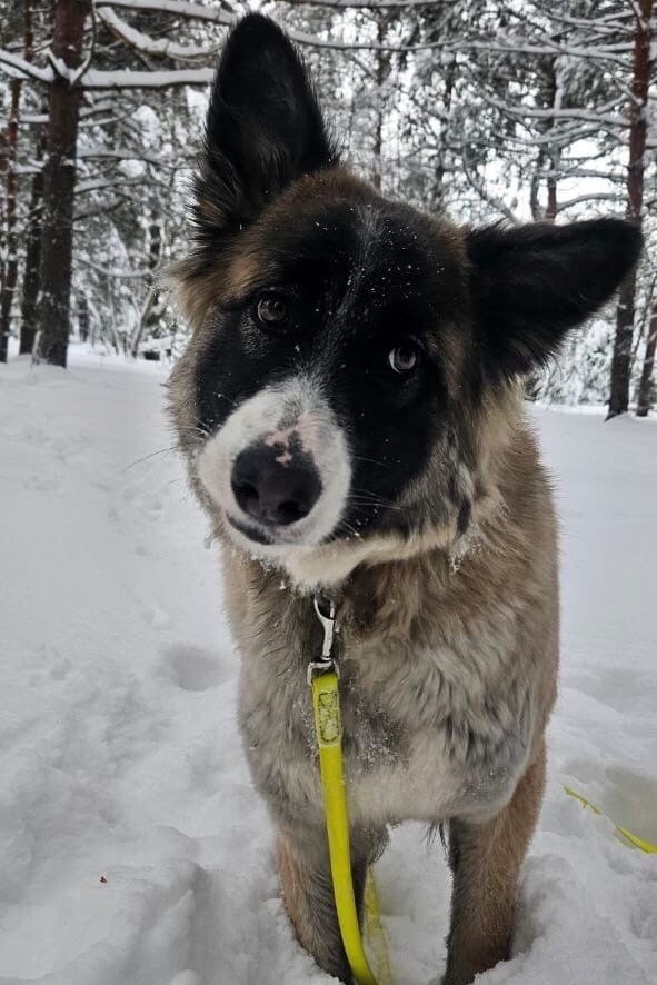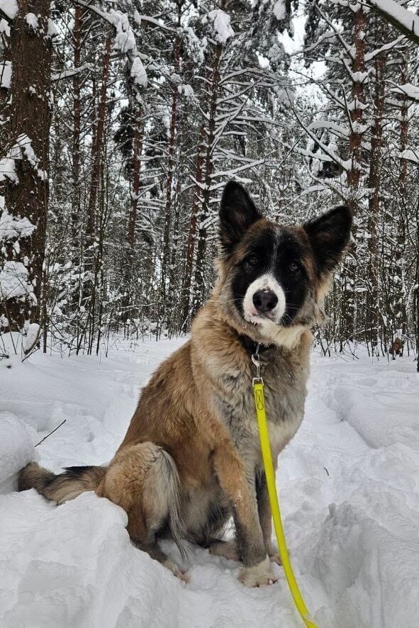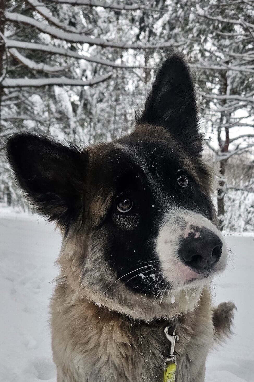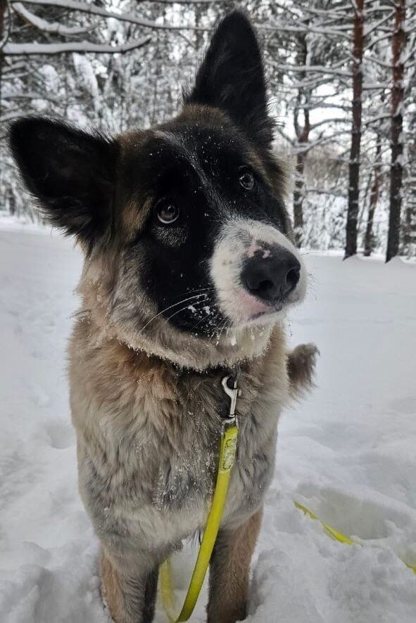 Молодая собака, ей не больше 1,5 лет, возможно метис американской акиты, очень красивая, с замечательным характером, совсем нет агрессии к сородичам, но немного робкая с человеком при первой встрече, ласковая и добрая.