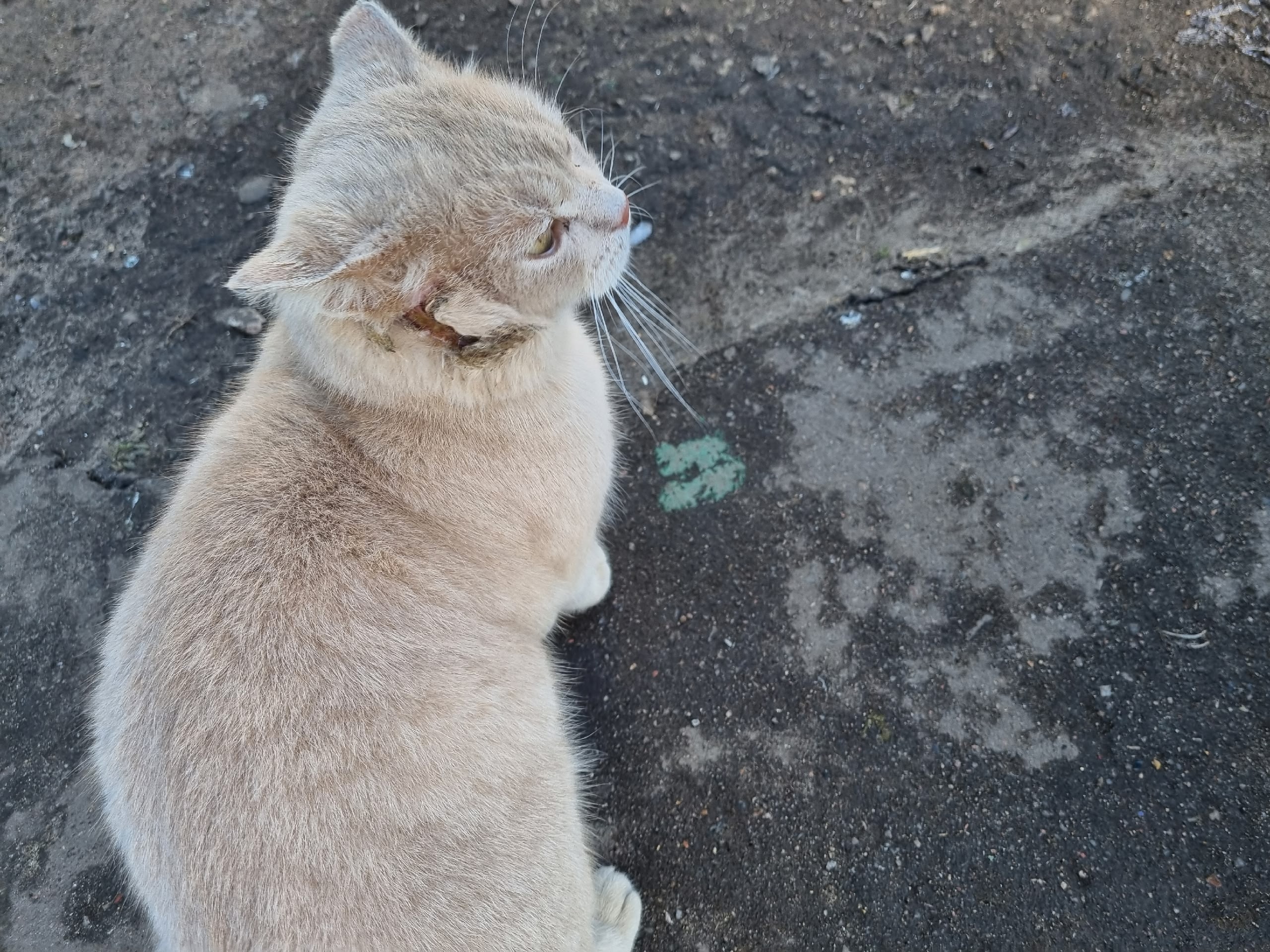 На улице Галочкина замечен вот такой бедолага! кот явно бывшедомашний. У него на шее рана неизвестного происхождения. Видевшая котика просит помочь. Нахожусь сама не в О-З.. Могу быть сокуратором.