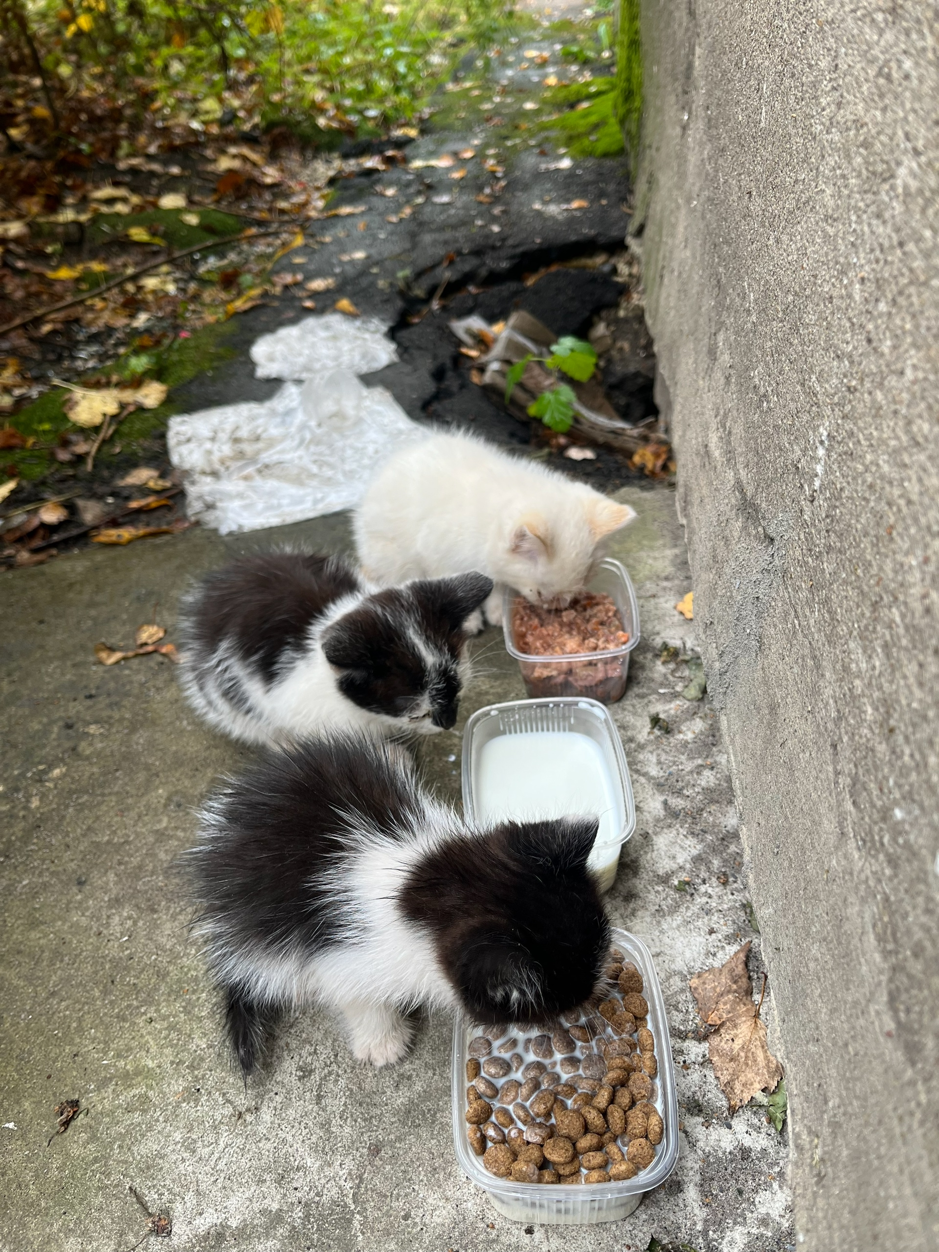 Орехово-Зуево, ул. Бугрова. Вот такие малышарики выбежали к нам из под щели в жилом доме. К сожалению у самой уже просто нет места забрать, прошу добрых людей откликнуться. Котята на вид здоровы, помогу с обработками и если потребуется оплачу осмотр у ветврача. Кошки поблизости не было видно что то случилось потому что они как нас увидели с диким криком кинулись под ноги. Естественно я накормила и напоила, положила теплый свитер в щель. Разберите пожалуйста таких прелестных малышей ведь пропадут, тем более женщина проходившая увидела как я кормлю и стала выражать недовольство. Эх что с людьми происходит, почему такие жестокие забыли уже как кошки во время великой отечественной русский народ спасали ценой своей жизни, позор таким, надеюсь Кара их настигнет. Номер для связи 89164661899 Анна