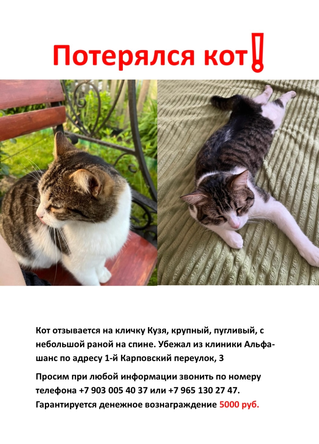Павловский Посад❗️ Потерялся кот❗️Убежал из клиники Альфа-шанс, 1-й Карповский переулок. Может находиться в районе улиц Герцена или Каляева❗️❗️❗️ Просьба при любой информации звонить по номеру + 79030054037