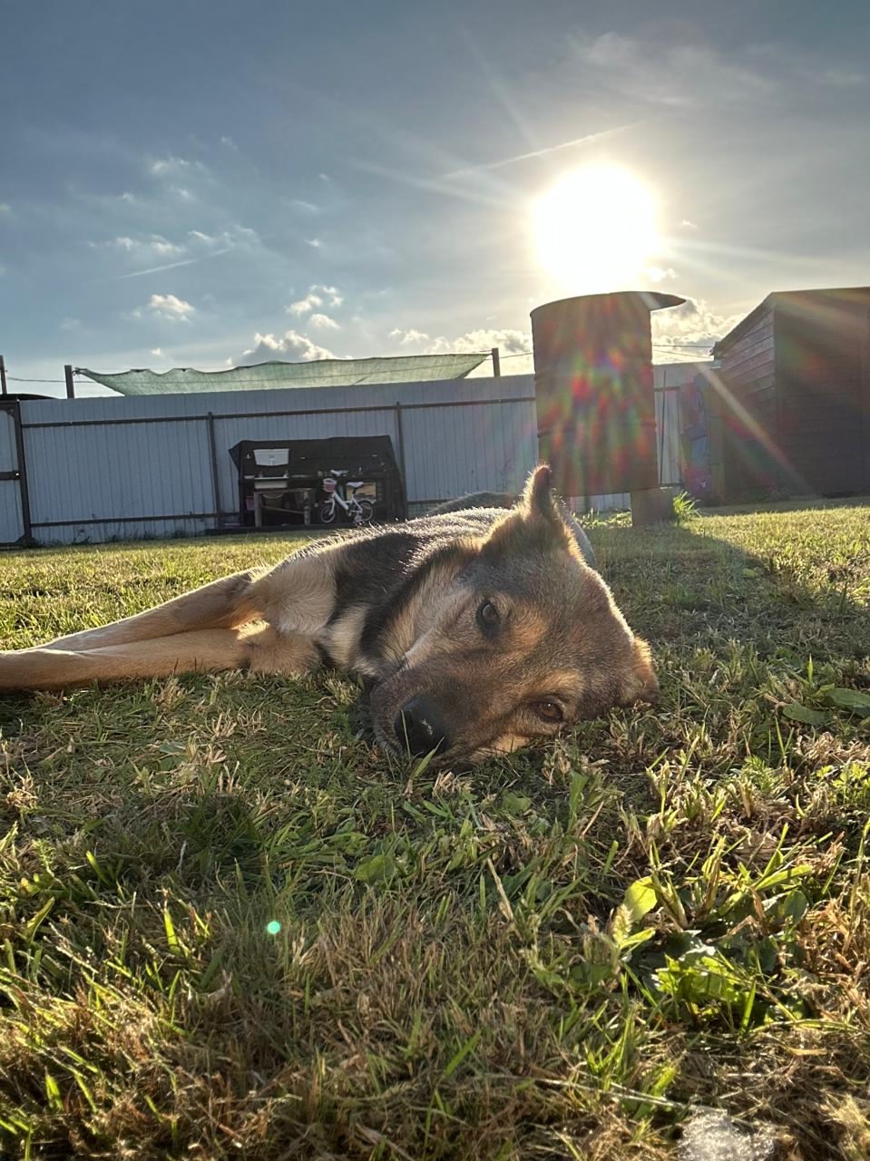 Через несколько недель она уже ходила за нами по пятам, виляла хвостиком, облизывала руки и подставляла голову для поглаживаний. Она подружилась с собаками, научилась с ними играть. Но к незнакомым ей людям относится с осторожностью, видимо все-таки успела пострадать от рук человека.