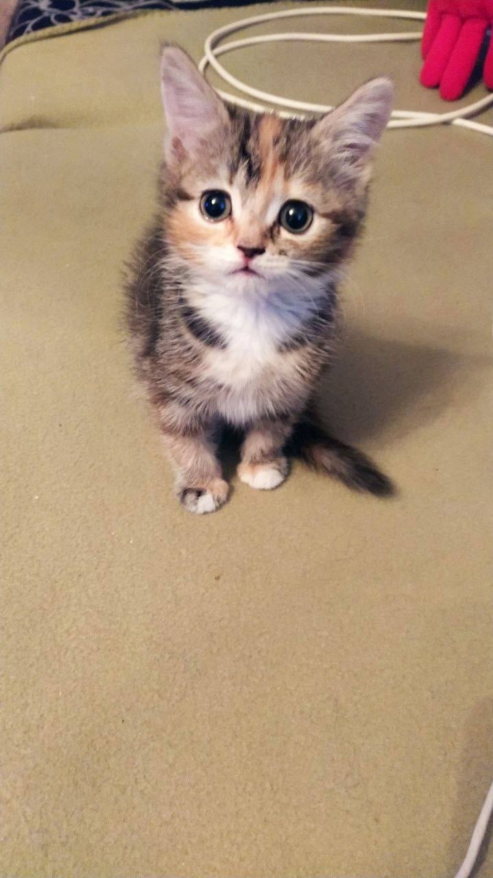 Снова подбросили в подъезд, девочка на вид около двух месяцев, чистенькая, красивая и трехцветная, спокойная и ласковая!