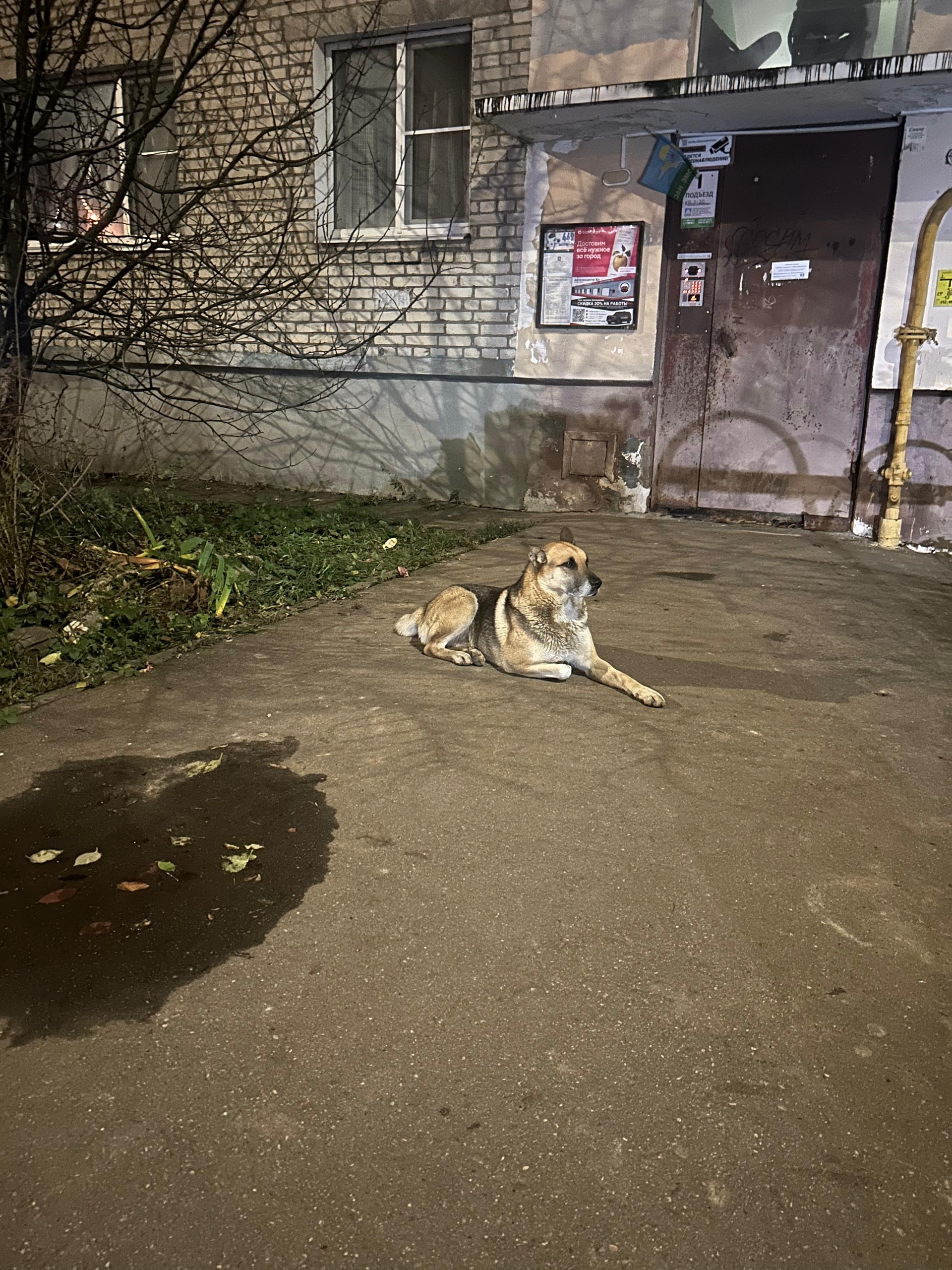 Подольск, улица Быковская, дом 13. Прибилась собака, мальчик, без ошейника, но похоже домашний, чистый, не голодный. Сидит у подъезда третий день, явно кого-то ждет. Может кто-то узнает/возьмет на передержку? Пес хороший, не агрессивный. Спит на земле, а ночью уже холодно