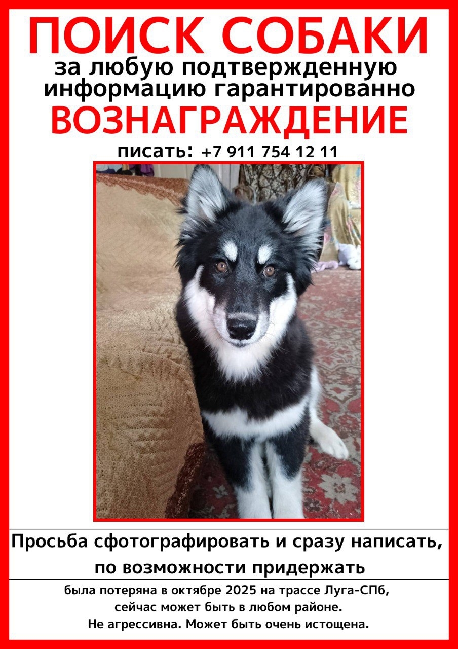 Была пристроена в семью, п. Локня, все было хорошо присылали приветы. Но сейчас мы выяснили, что собаку потеряли в октябре 2025 на трассе Локня-СПб, ни слова не сказав нам об этом.