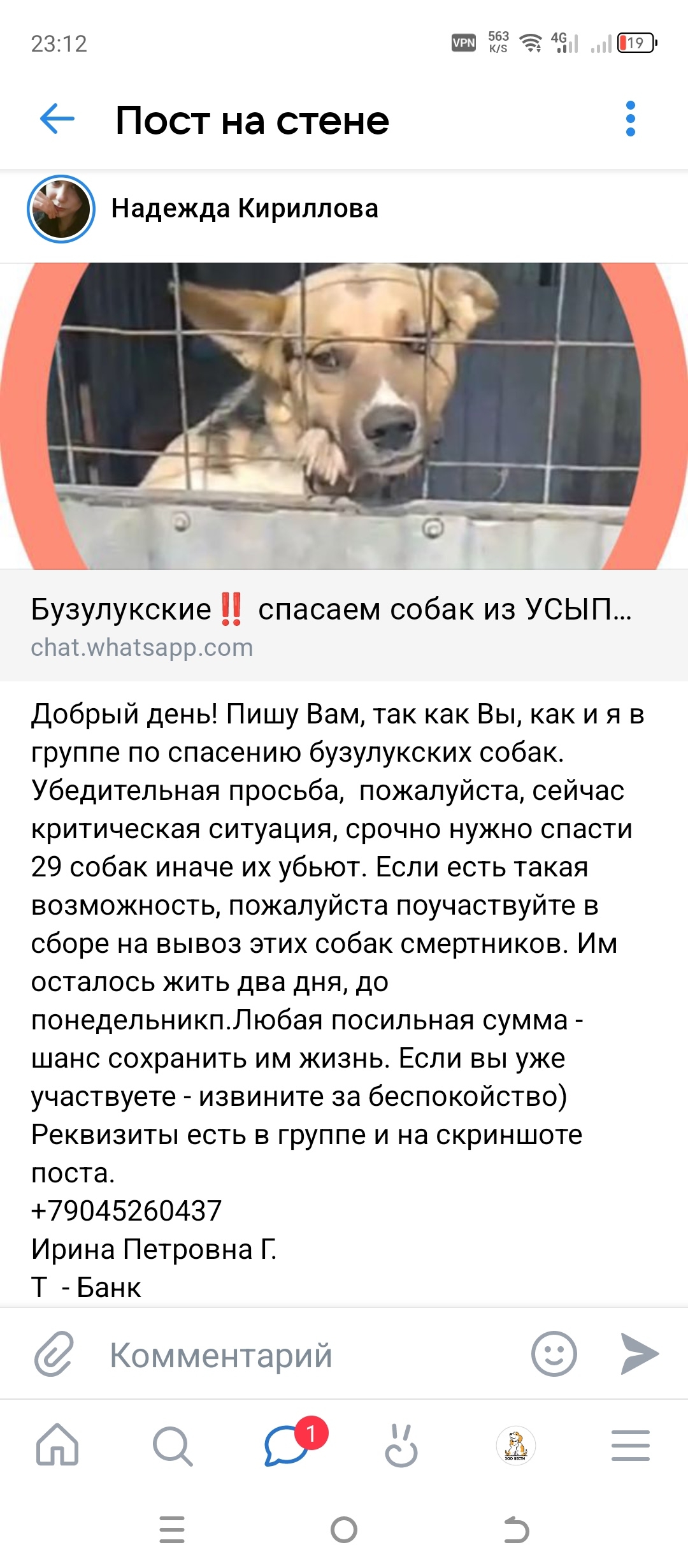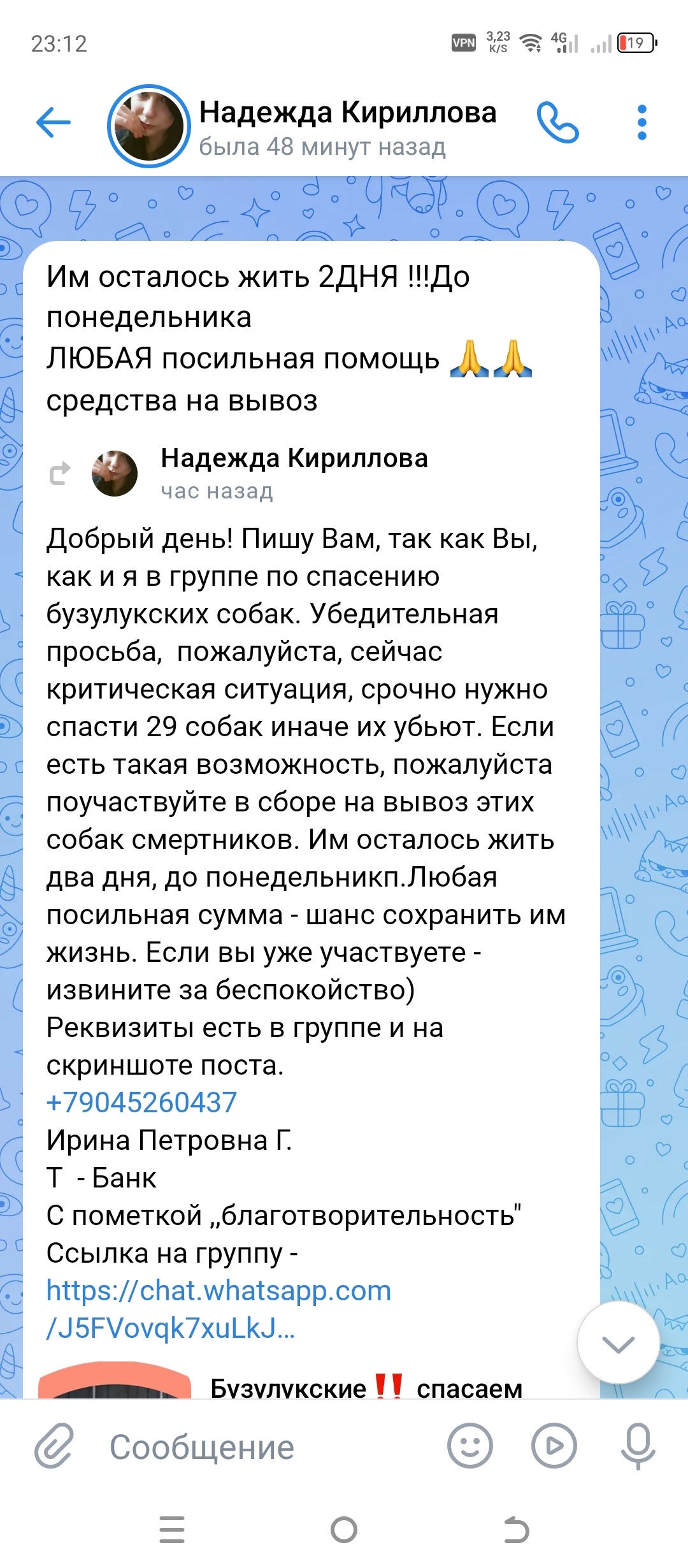 Добрый день! Пишу Вам, так как Вы, как и я в группе по спасению бузулукских собак. Убедительная просьба, пожалуйста, сейчас критическая ситуация, срочно нужно спасти 29 собак иначе их убьют. Если есть такая возможность, пожалуйста поучаствуйте в сборе на вывоз этих собак смертников. Им осталось жить два дня, до понедельникп.Любая посильная сумма – шанс сохранить им жизнь. Если вы уже участвуете – извините за беспокойство)