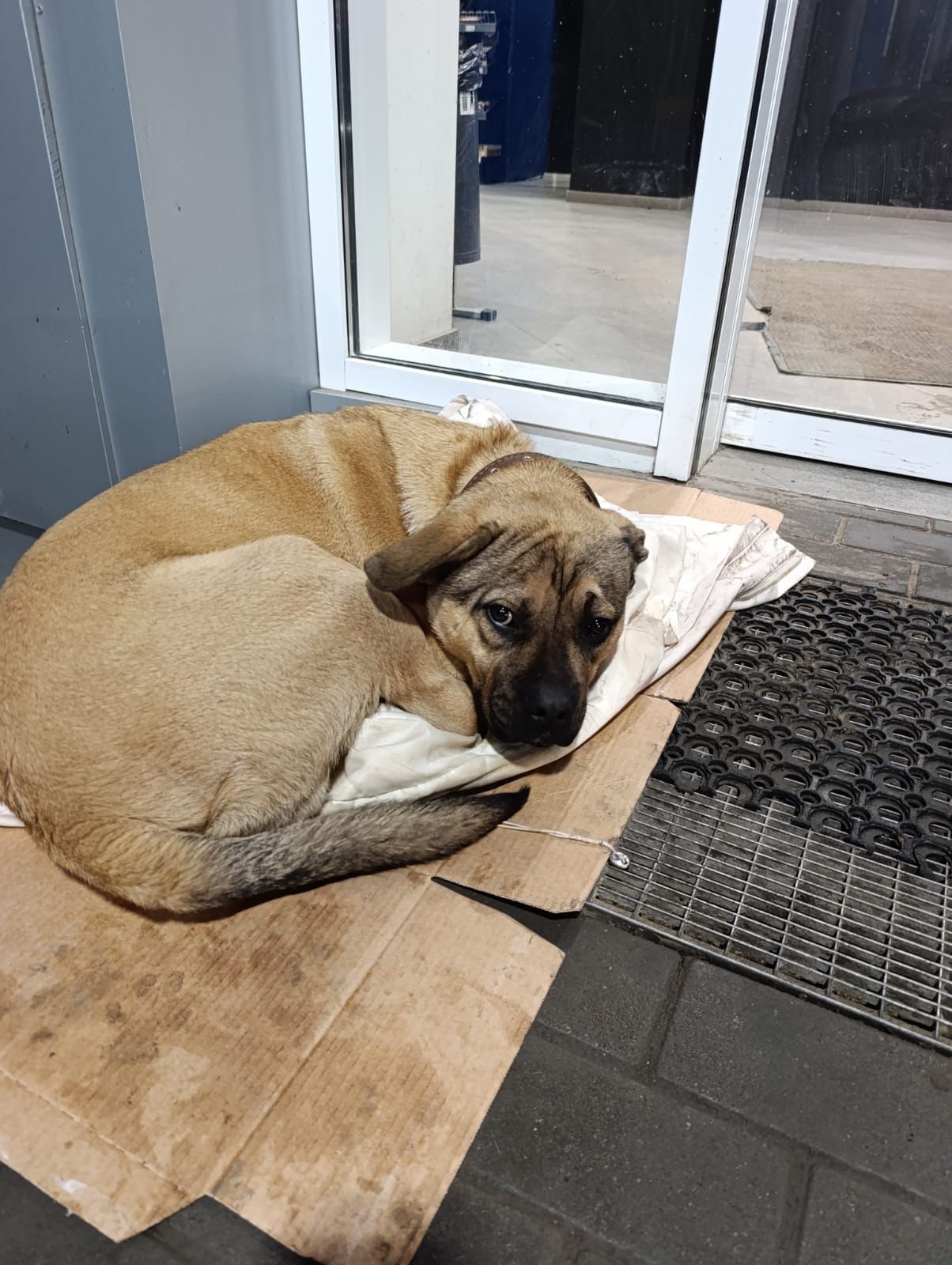 ‼️Алексин. Прислали сегодня. На заправке лежит собачонок, говорят, что скорее всего молодой, подросток. Похоже, метис бульдога. В коричневом ошейнике. Либо потеряшка, либо выбросили.