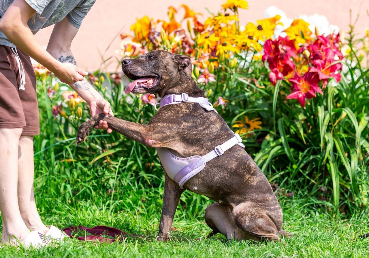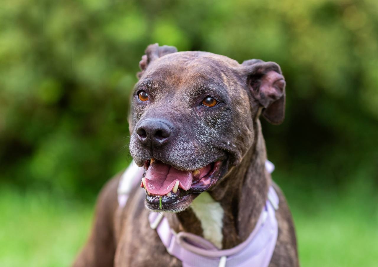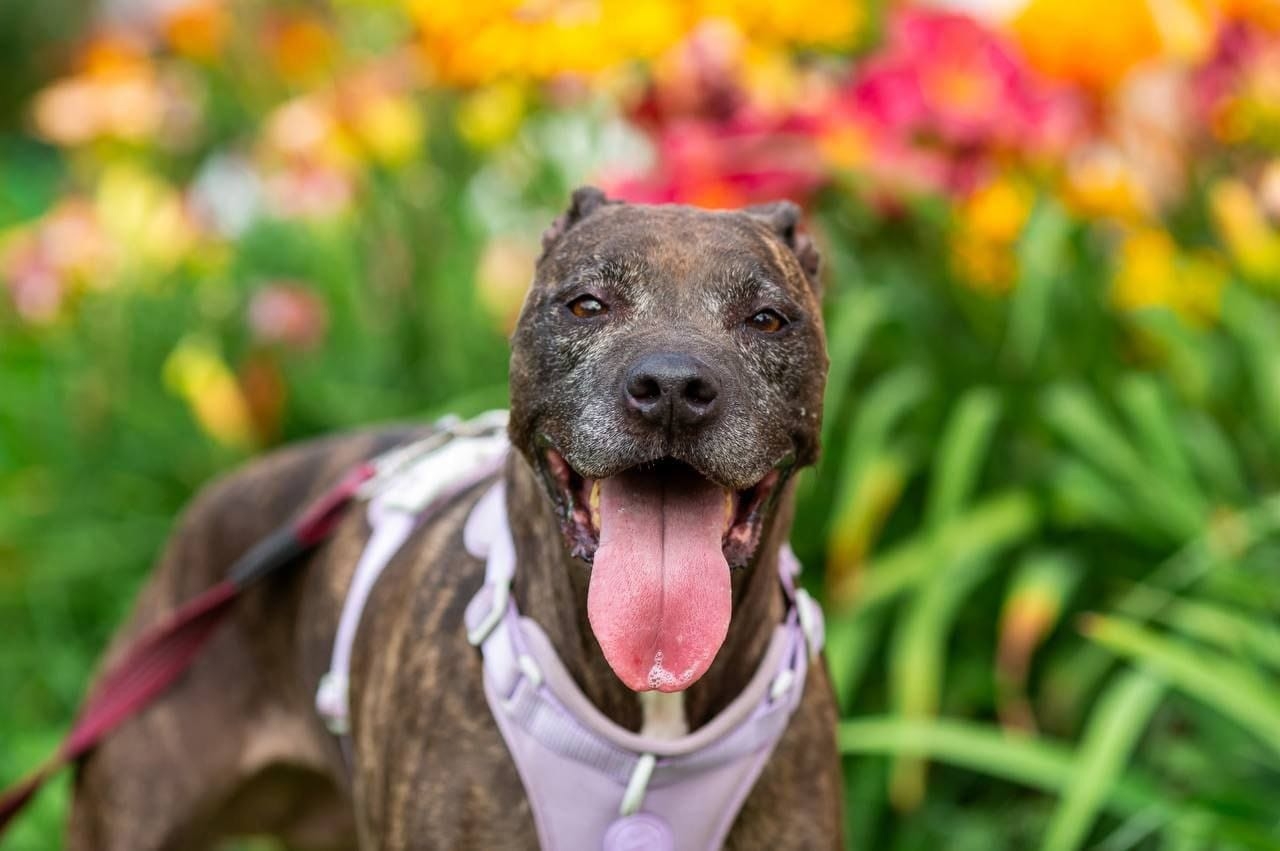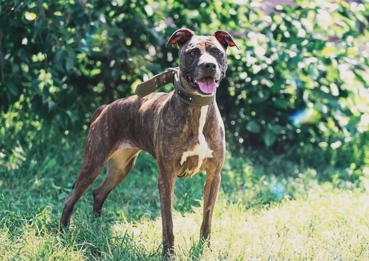 Питбуль, около 6 лет. Нашли привязанной к дереву больше двух лет назад. С тех пор находится на домашней передержке.