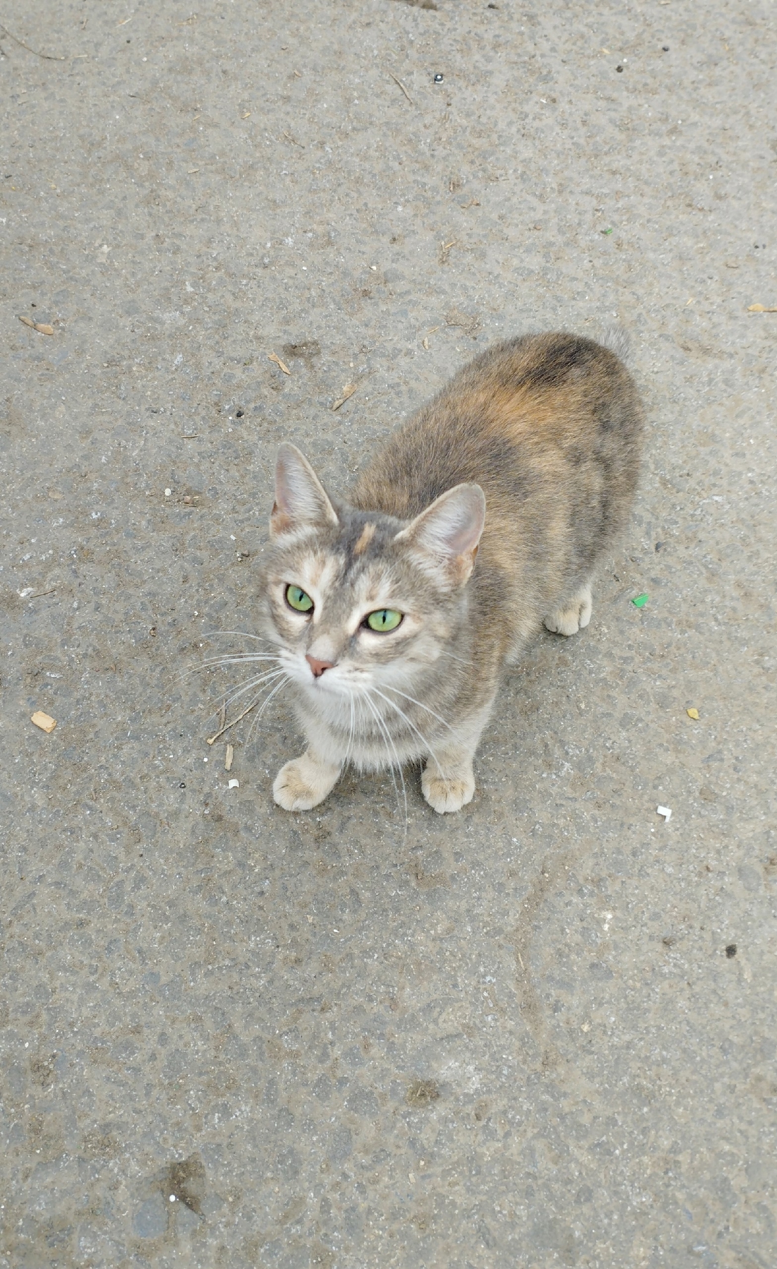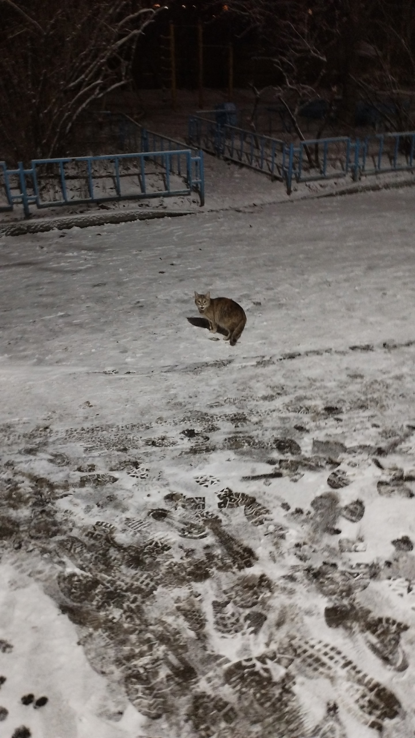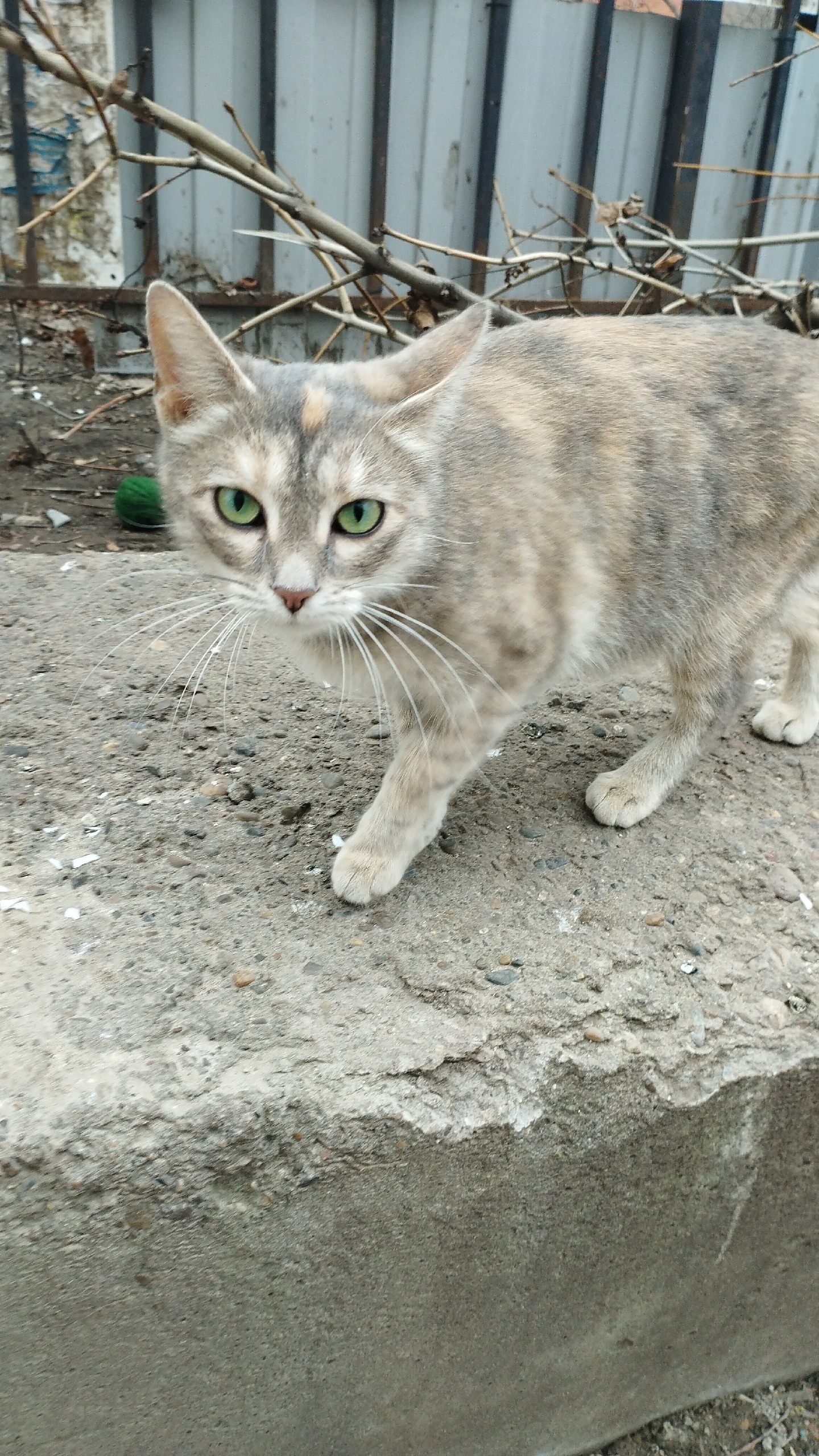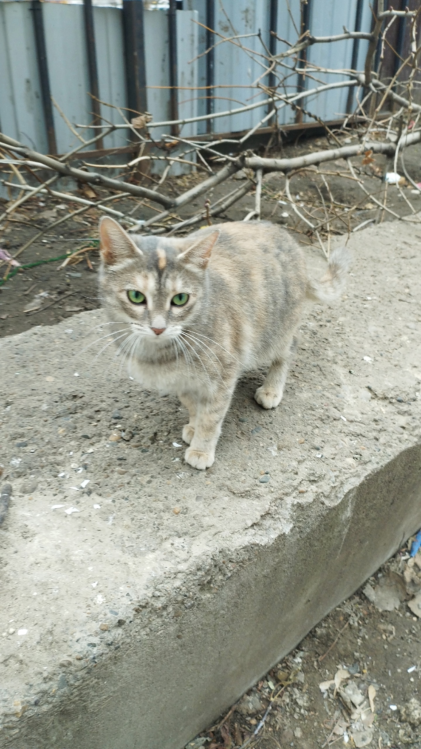 Молоденькая кошечка пытается выжить на улице. Холод, голод, собаки и местные коты, стандартный набор проблем, с которыми она сталкивается ежедневно. Неделю как появилась в соседнем дворе. До снега спала в листьях. Когда позовешь, бежит, мяучит, очень голодная. Всегда настороженно кушает, гладить разрешает, ласкается.