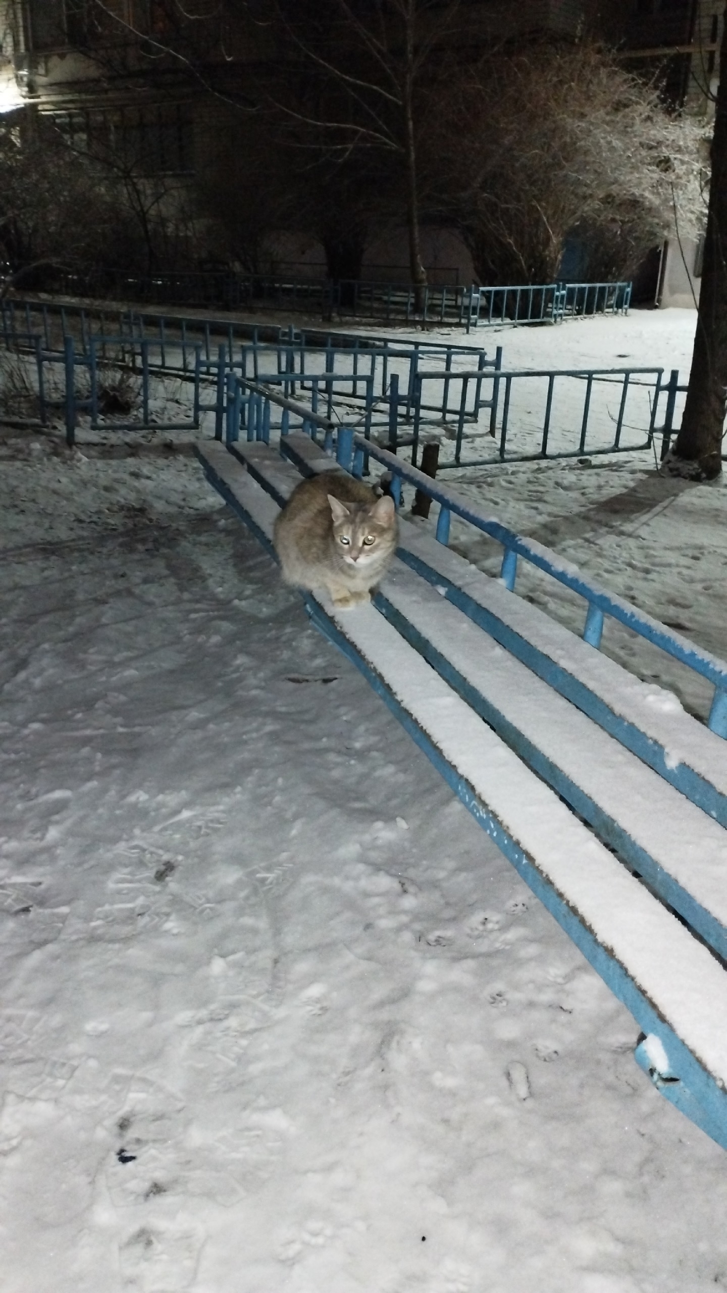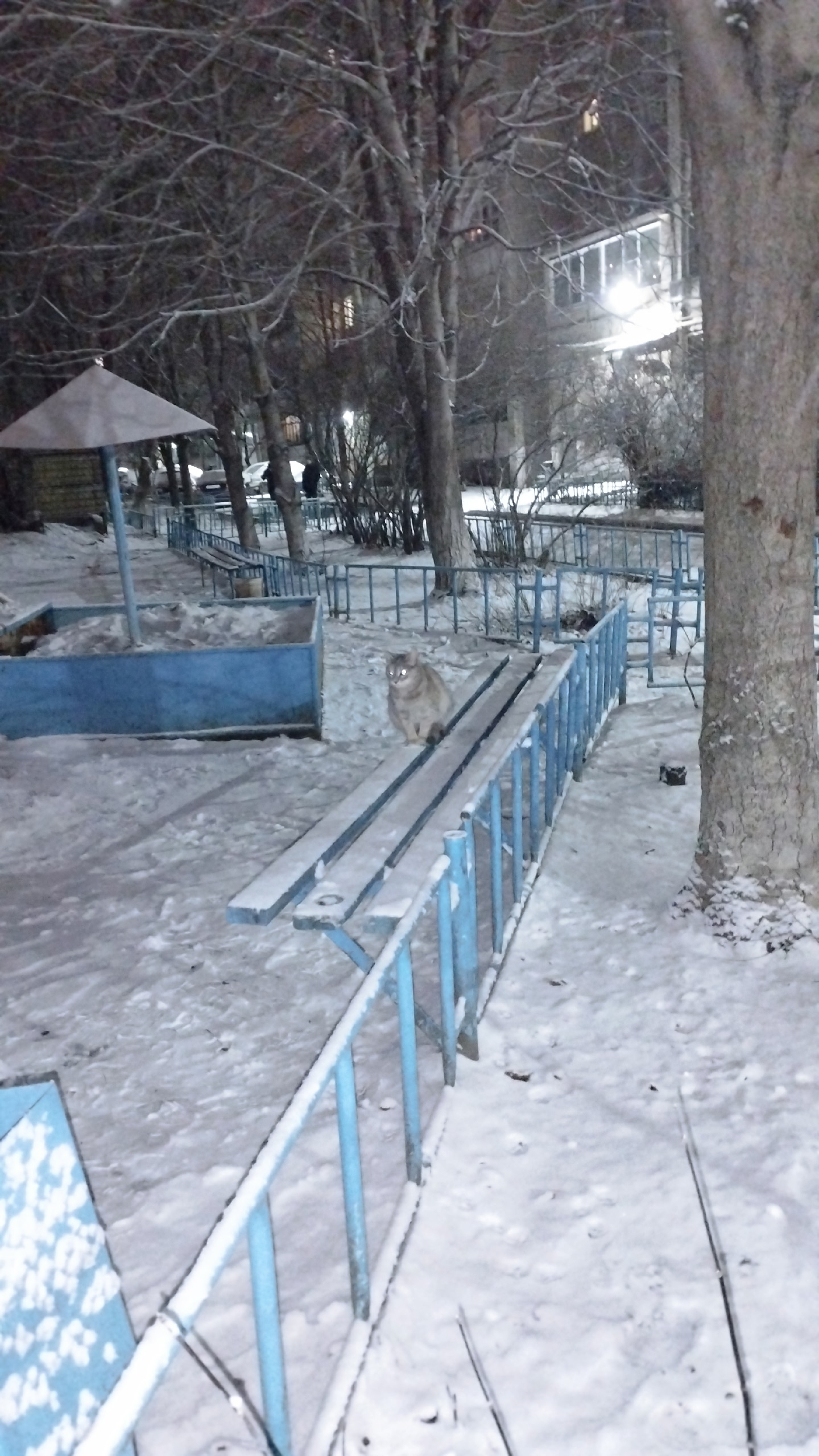 Сидит и ждёт на лавочке в снегу своего человека, который сможет подарить ей дом.