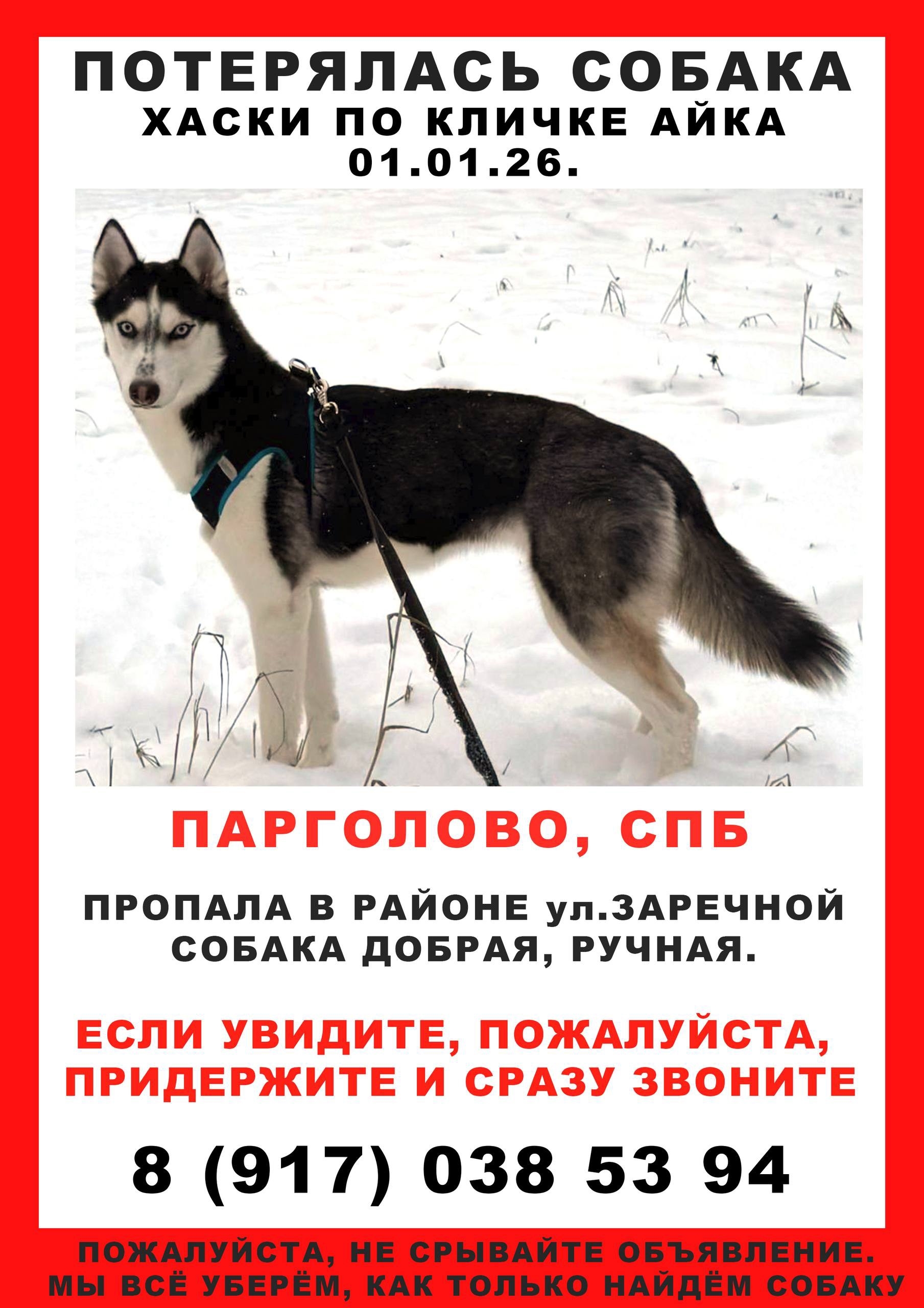 потерялась хаски, испугалась салютов, вырвалась из.. Сертолово Автор admin Опубликовано Янв 2, 2026 0 0 Поделится WhatsAppViberTelegramVKOK.ru потерялась хаски, испугалась салютов, вырвалась из амуниции..есть сигналы, перебежала Шуваловский парк ,видели её бегущей в сторону Сертолово, нужна помощь в поисках 🙏🙏🙏 0 0 Поделится
