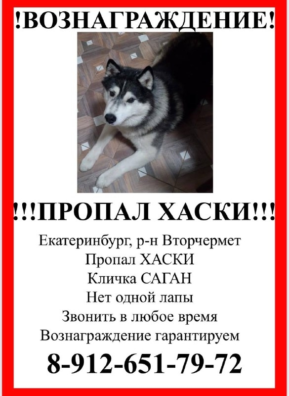 Пропал ХАСКИ, кличка САГАН, в 7:40 выскочил из двора!