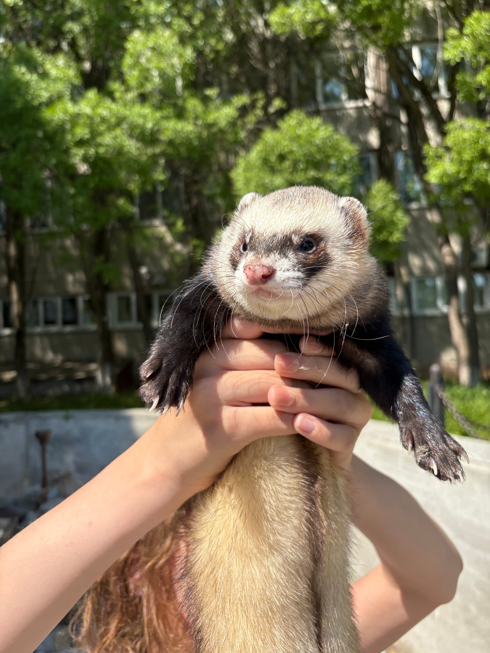 в 8 утра сестра уходила в школу, в подъезде было темно и не заметила, что хорек убежал. 2 часа он сидел в подъезде, но потом его выпустили и сейчас неизвестно где он находится, обошли все подвалы, всю территорию, найти не можем