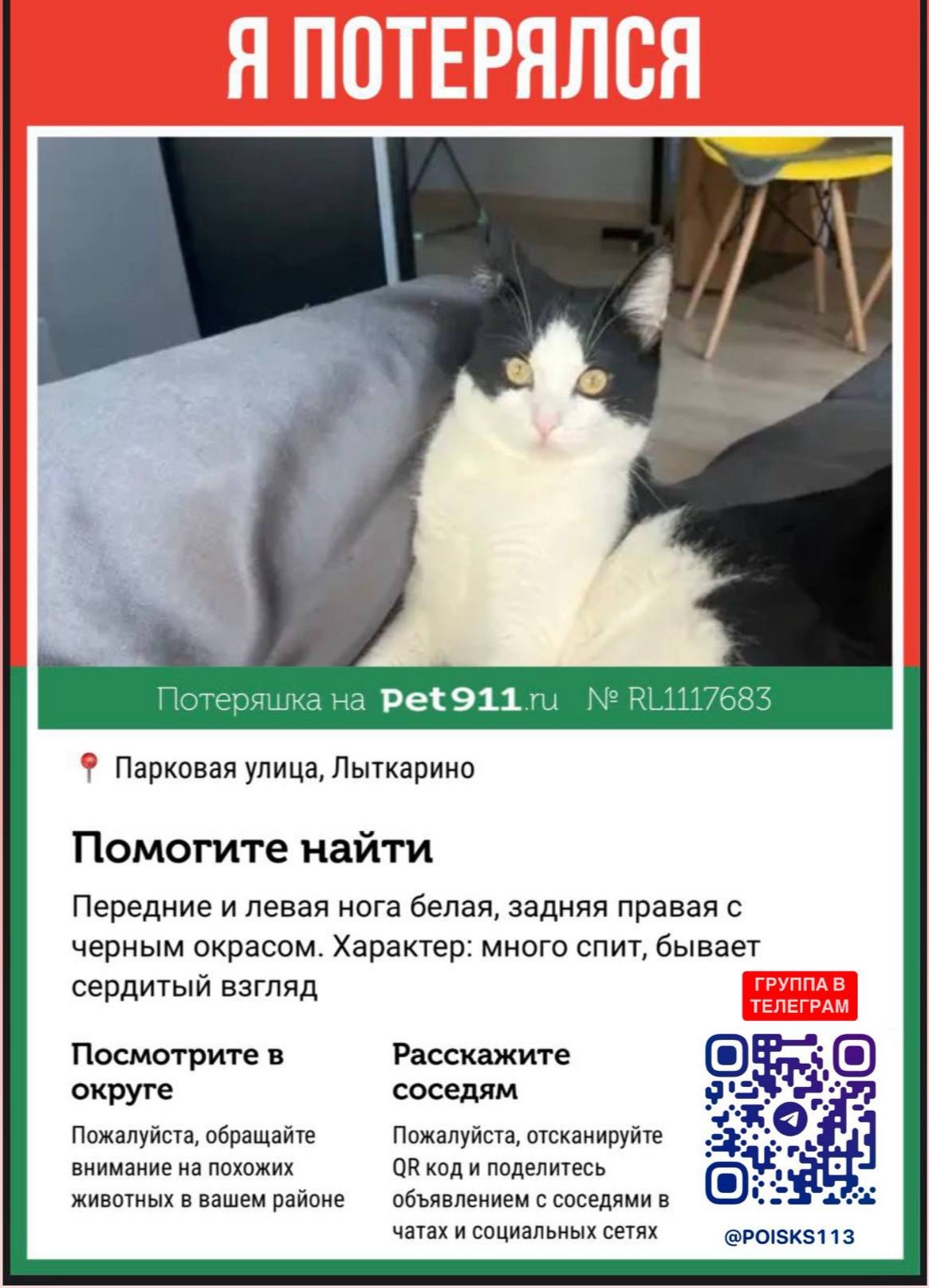 Потерялся кот ШУСТРИК в районе Парковой 12 Просьба если нашли..