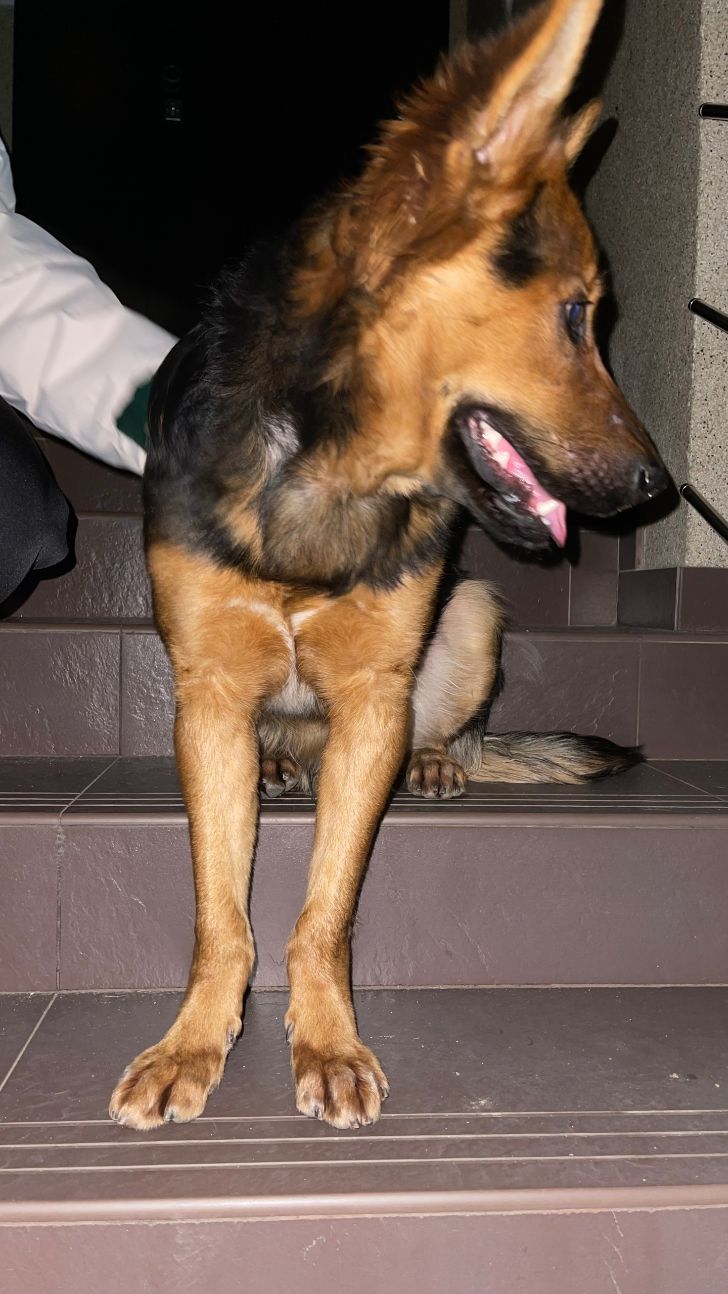 Сидит у подъезда собака, по виду помесь немецкой овчарки, молоденькая, мальчик