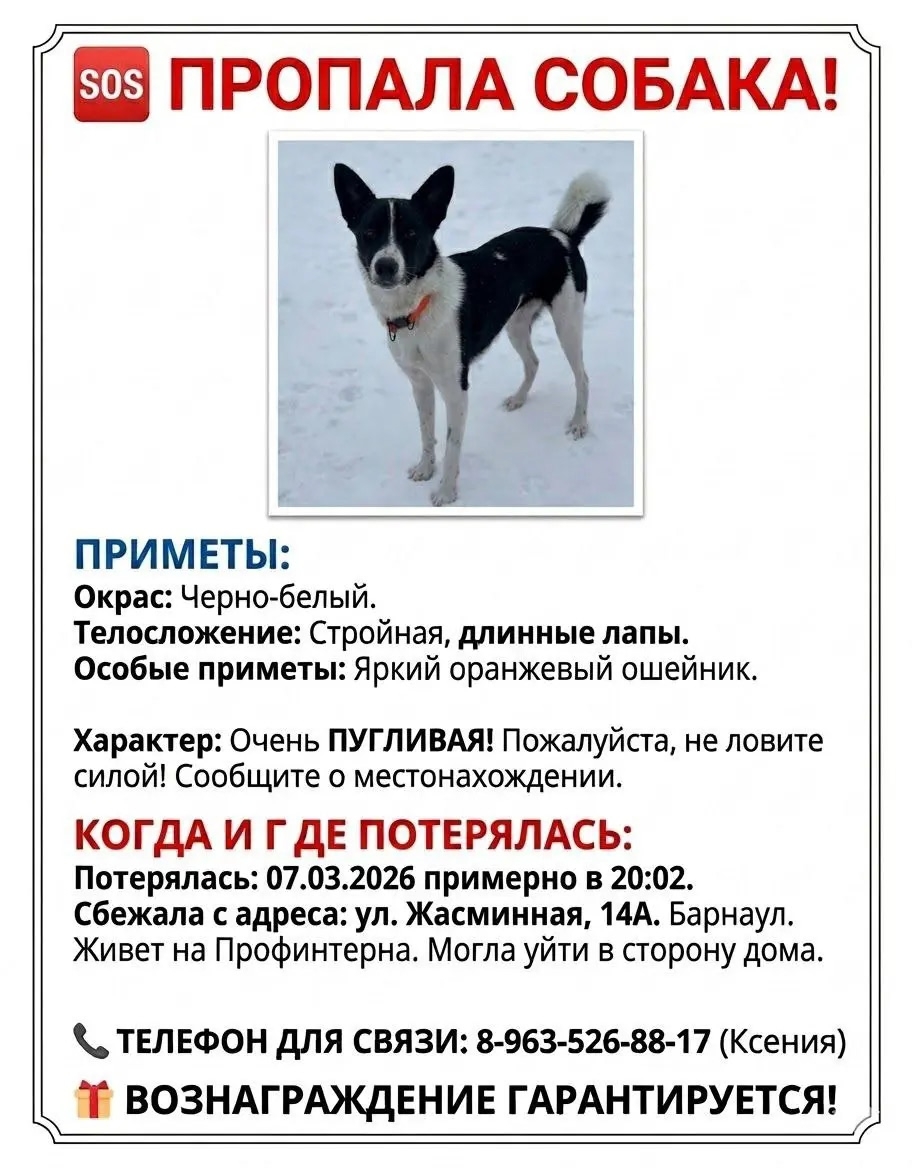 Лично видел 09.03.2026 в 00:55 около ГАИ Павловский тракт 317,убежала в неизвестном направлении. После этого продолжали поиски вдоль Трактовой. Сначала с чëтной, далее с нечëтной стороны. Ровно в 03:00 вернулись на пост ГАИ, завершив поиски. Она очень сильно напугана. Хозяина даже боится