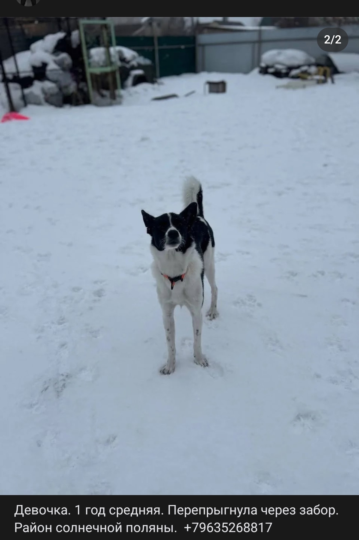 Девочка. 1 год. Средняя. Зовут Лепёшка. Откликается на имя и на свист. Очень быстро бегает. Перепрыгнула через забор. Район Солнечной поляны, оставили на передержку. Сбежала примерно в 20:00 07.03.2026 с Ул. Жасминная, предположительно в сторону Энтузиастов. Могла побежать в сторону центра, ибо живëм около изумрудного. Очень любит других собак. К людям недоверчива. вознаграждение: 10т.р.